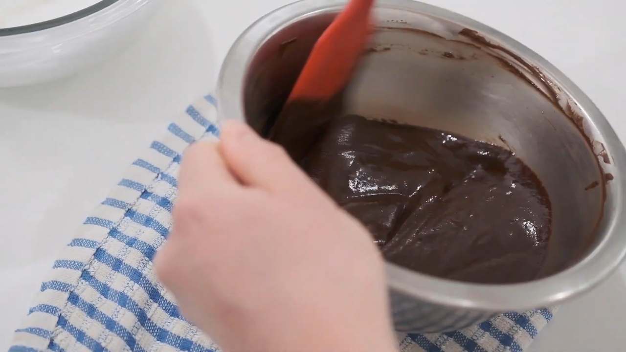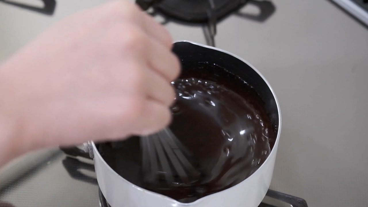 ボウルにチョコレートとバターを入れ、湯煎にかけて溶かす。- 2