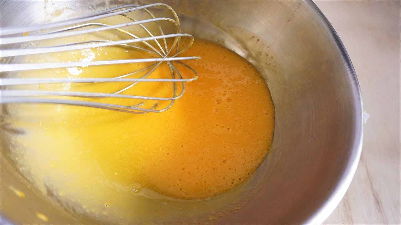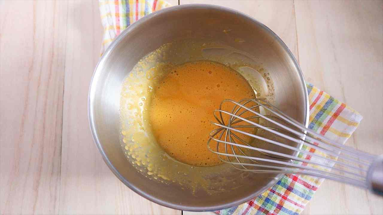 卵黄にグラニュー糖の1/3程度を入れ、少し白っぽくなるまですり混ぜる。