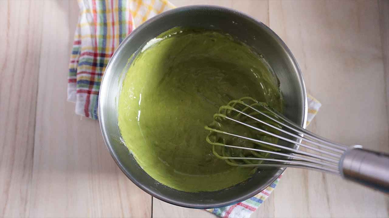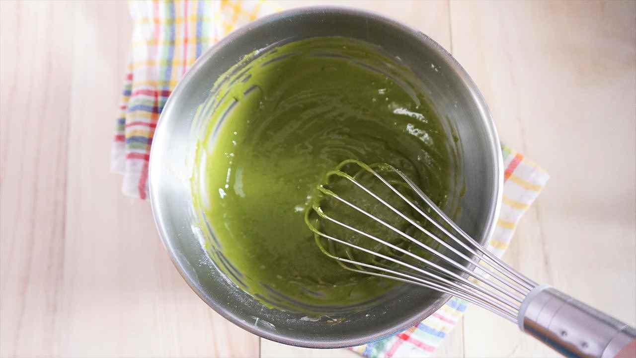2に抹茶液を加え、全体が緑色になるまでしっかり混ぜる。