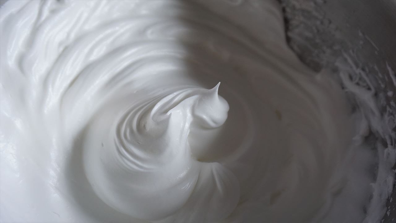 メレンゲは、角がツンと立って、ハンドミキサーの感触が重くなった時が目安。しっかり角が立ってキメとツヤがある状態にする。