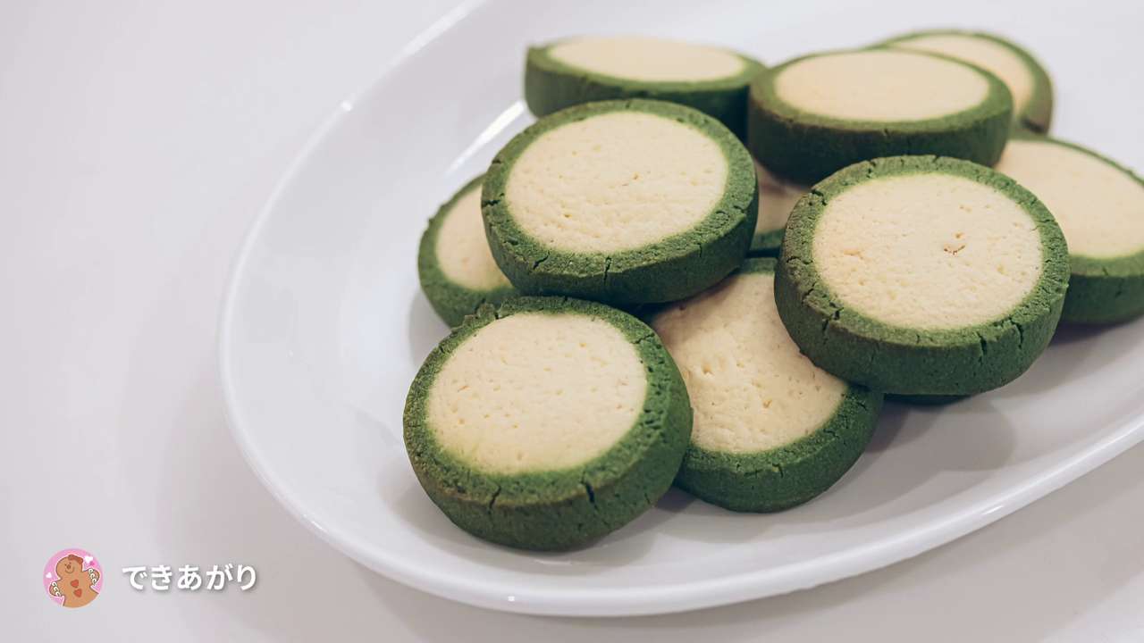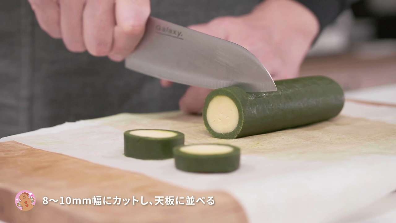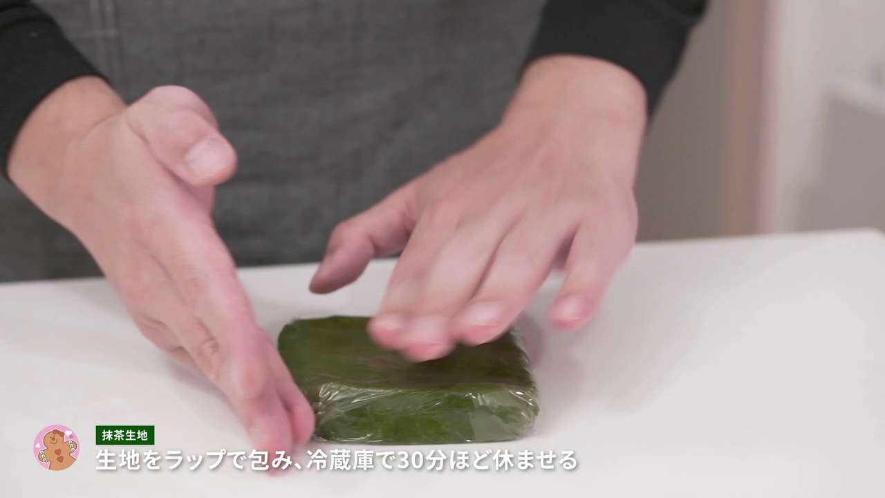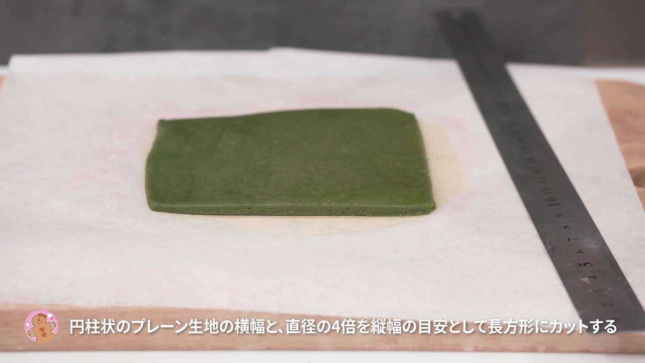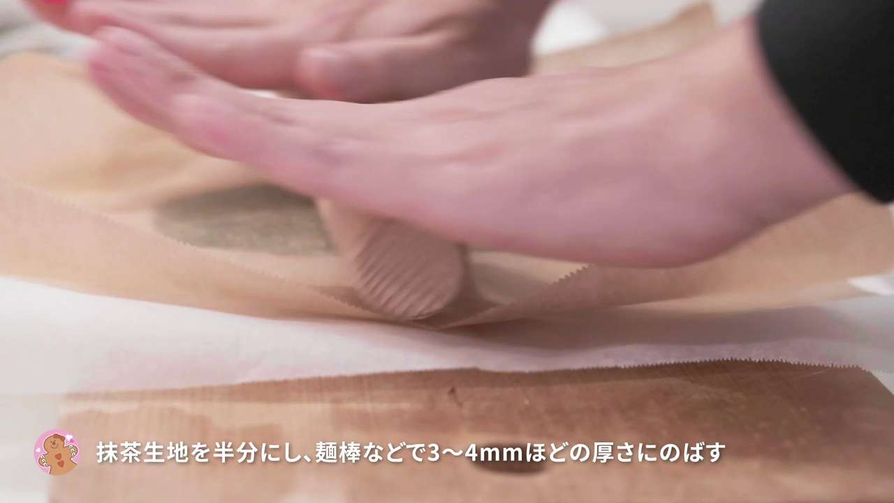 抹茶生地を半分にし、麺棒などで3〜4mmほどの厚さにのばす- 3