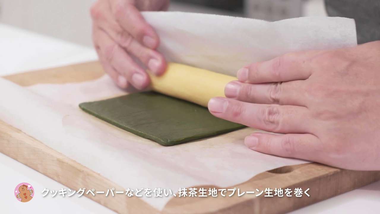 クッキングペーパーなどを使い、抹茶生地でプレーン生地を巻く- 5