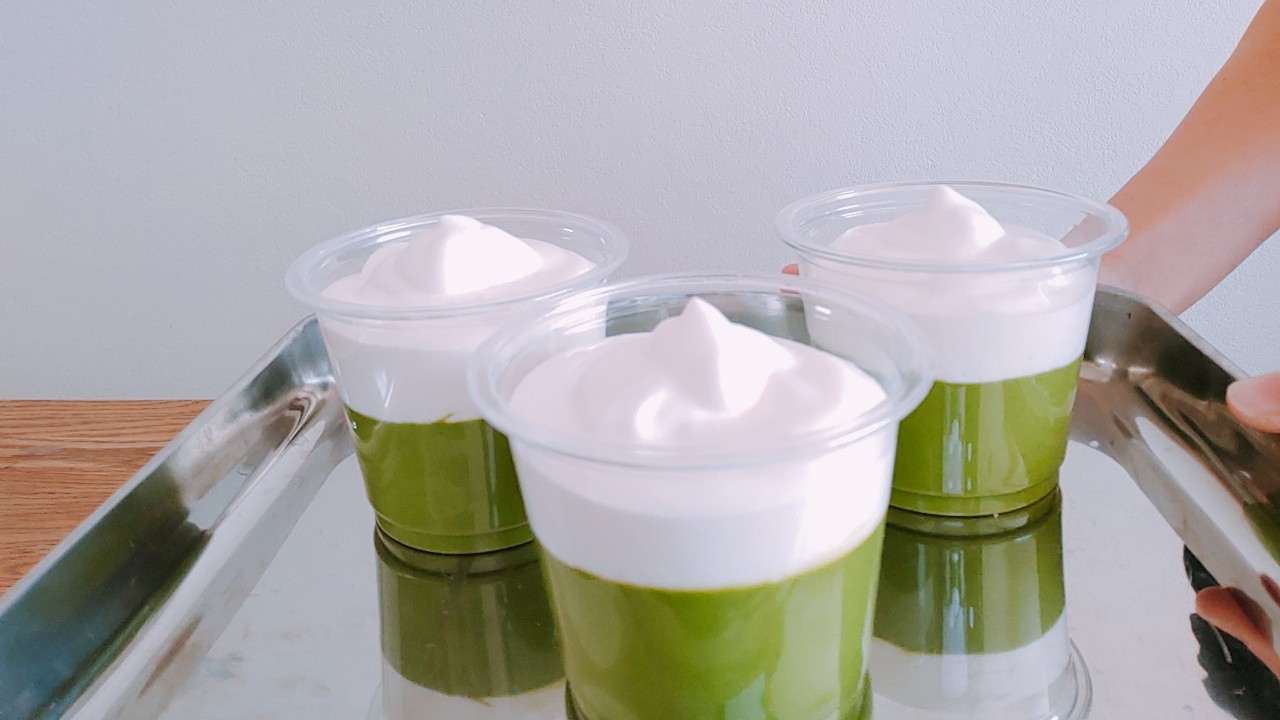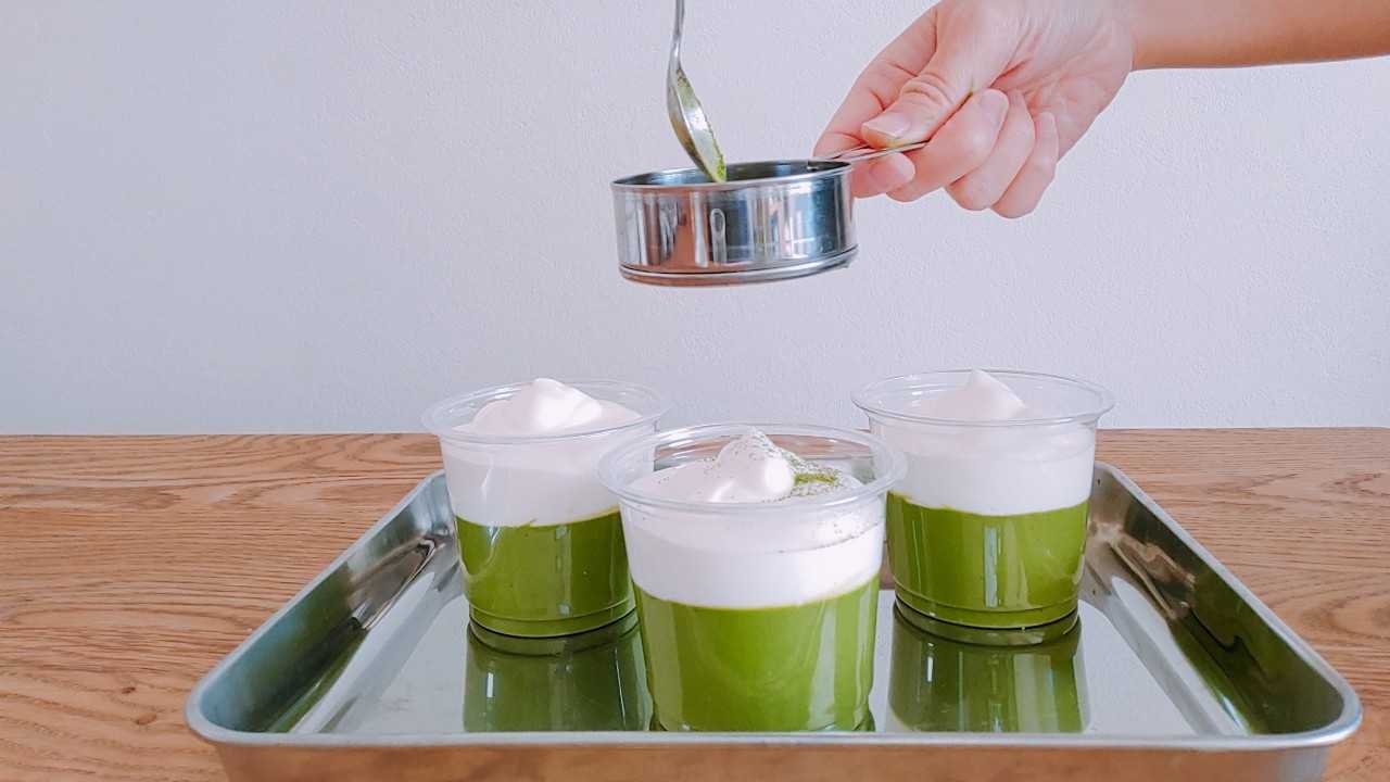 冷やしておいた抹茶プリンを冷蔵庫から取り出し、プリンの上に⑧のクリームをふんわりとのせます。- 2