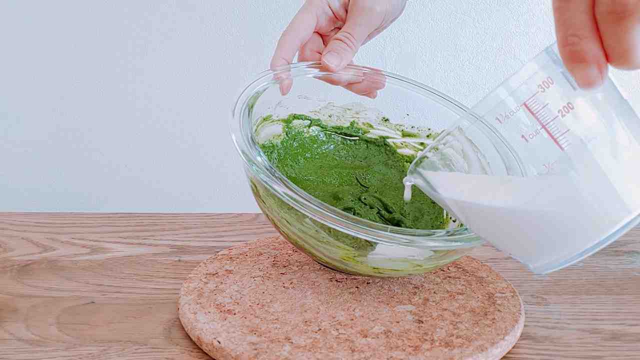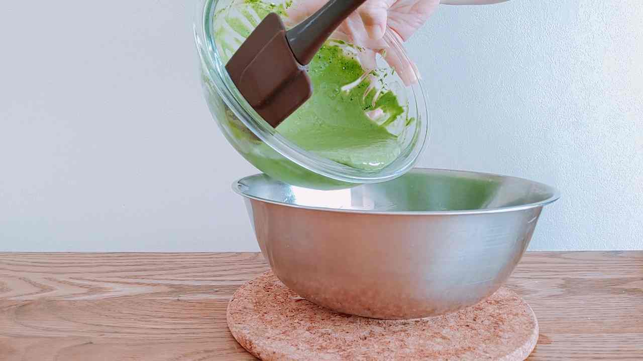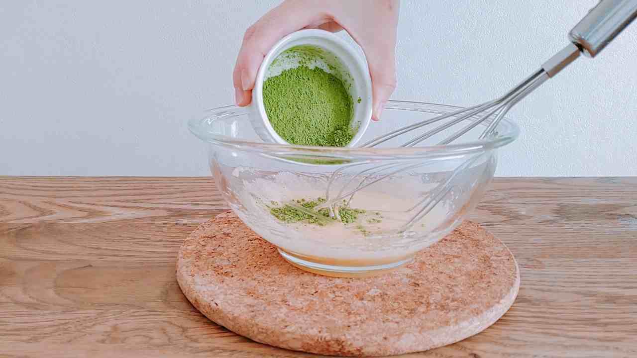 抹茶の粉を加えて、よく混ぜ合わせます。- 3