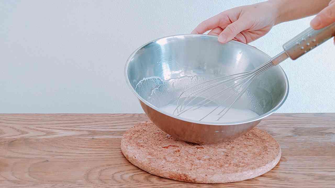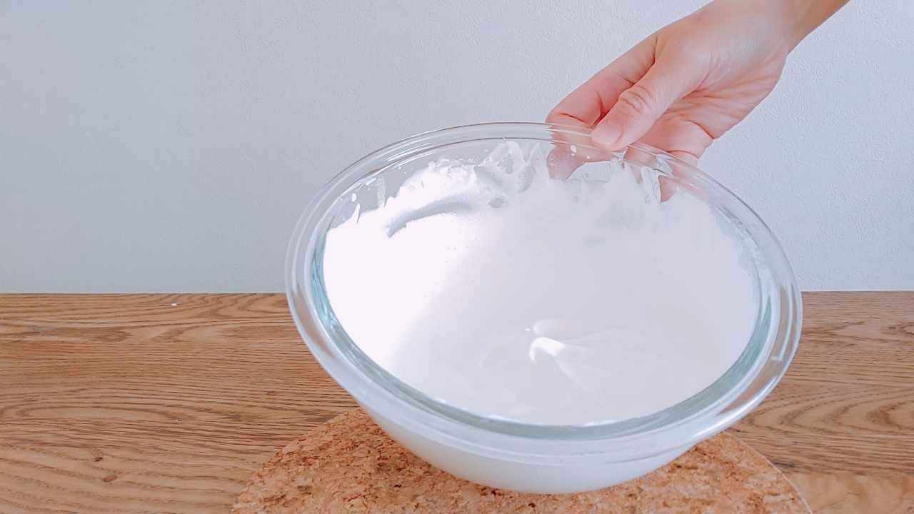 もしくは、氷を入れたボウルに、一回り小さなボウルを入れて生クリームを泡立てましょう。温度が高い部屋では、空気が充分に取り込まれる前に固まってしまって、きめの粗いクリームになってしまいます。