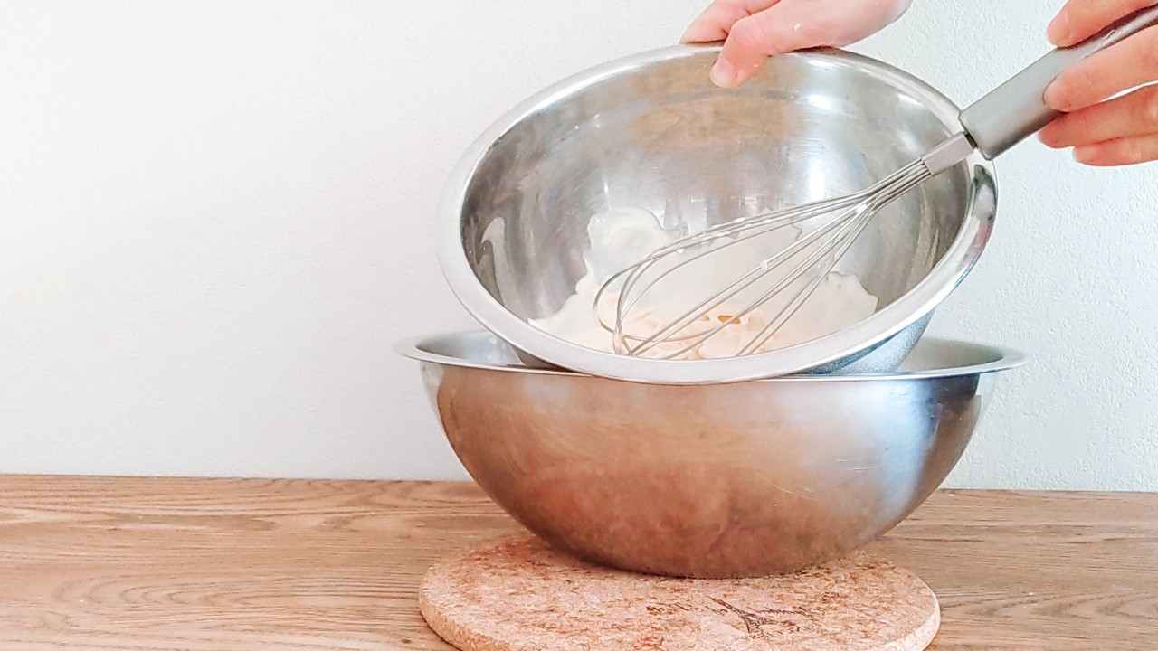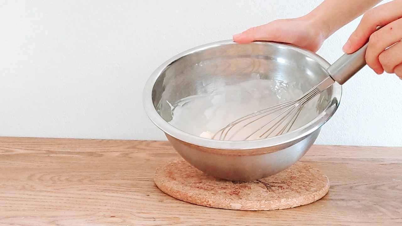 別のボウルに湯せんをして、その中に一回り小さなボウルをセットして、ホワイトチョコレートが溶けるまでゆっくり混ぜます。