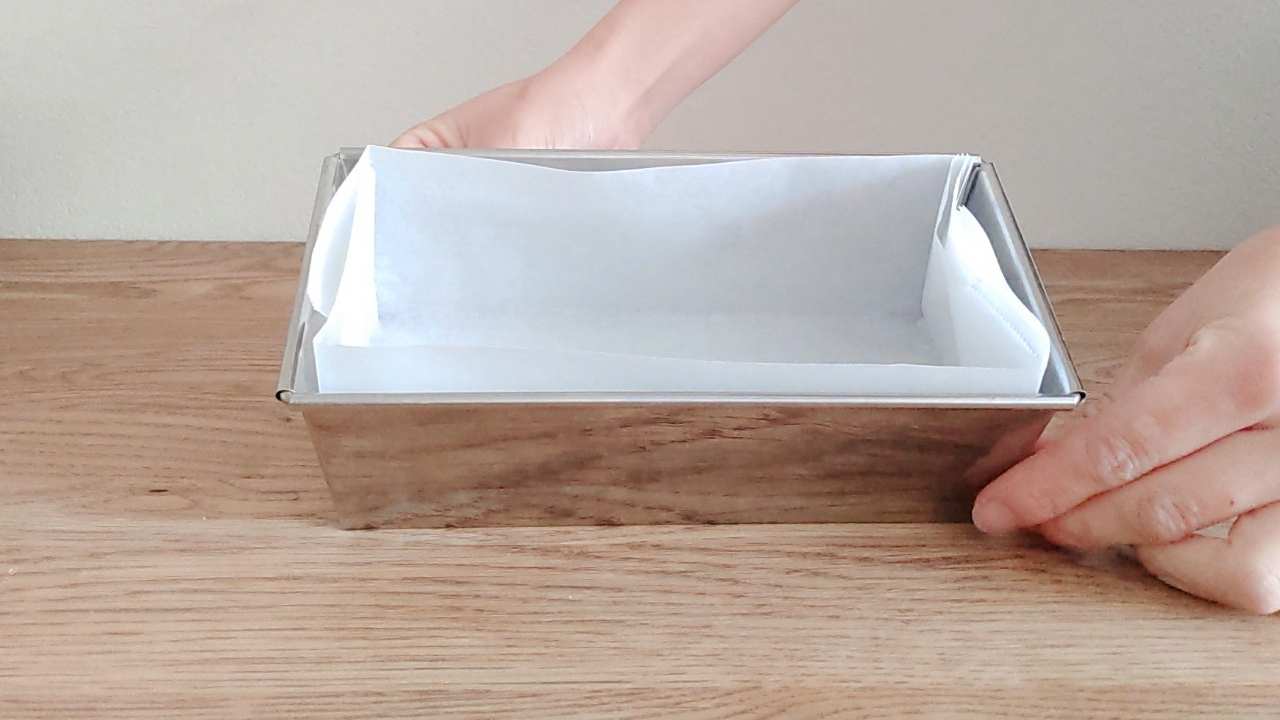 クッキングシートを型に合わせてセットしておきます(型に合わせて折り目をつけます)