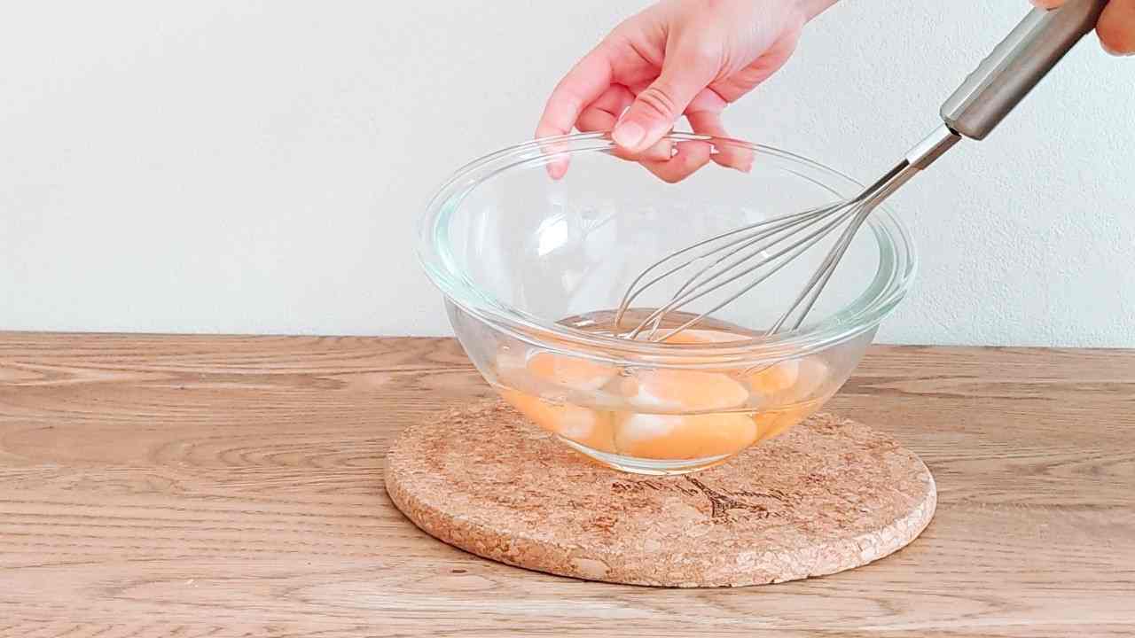ボウルに卵3個を入れて、泡立て器で溶きほぐします。