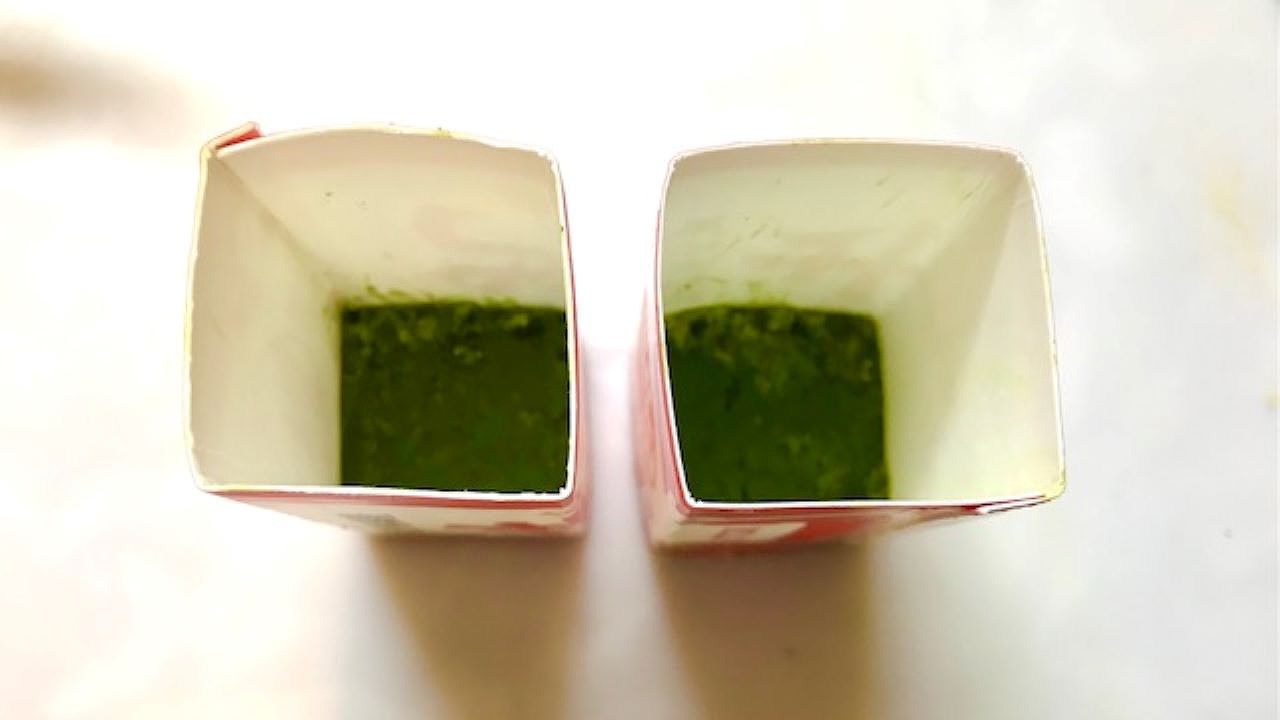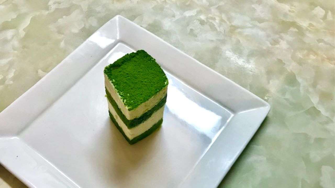 抹茶の緑と白いクリームが映えるよう高さのあるスクエア型にしました。和と洋が融合した贅沢なデザートに仕上がりました。大きな型で作って切り分けたり、小瓶に入れたりと、お好みでアレンジしてくださいね。
