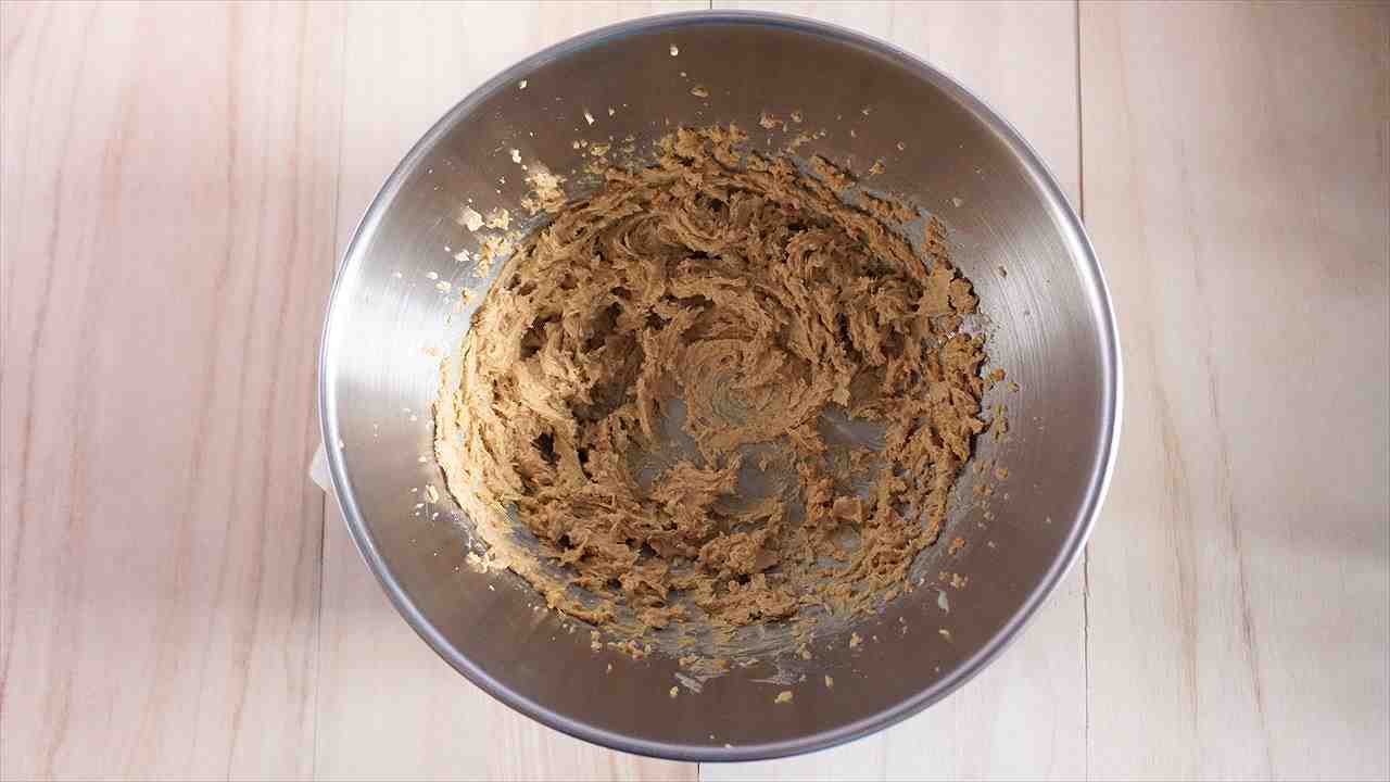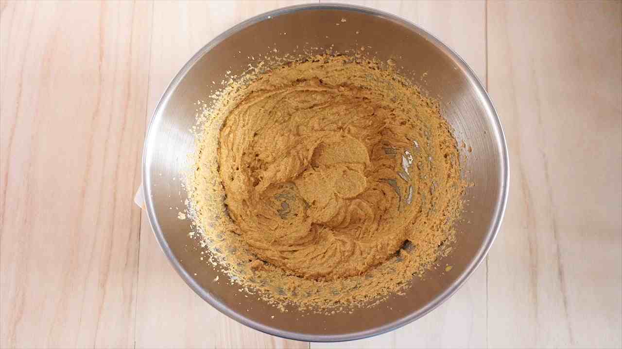 ポマード状のバターにブラウンシュガーを加え、やや白っぽくなるまで攪拌する。