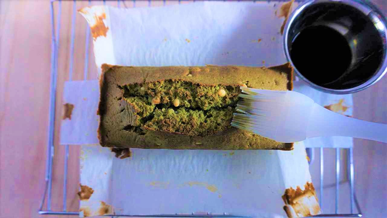 焼きあがったらすぐに型から取り出し、熱いうちに抹茶リキュールをハケで全体に塗る。