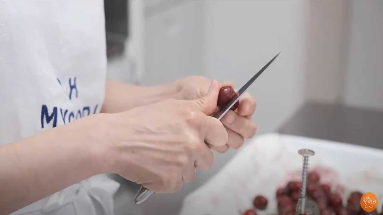 残りのチェリーの種を抜き、ペーパータオルの上に並べる。
