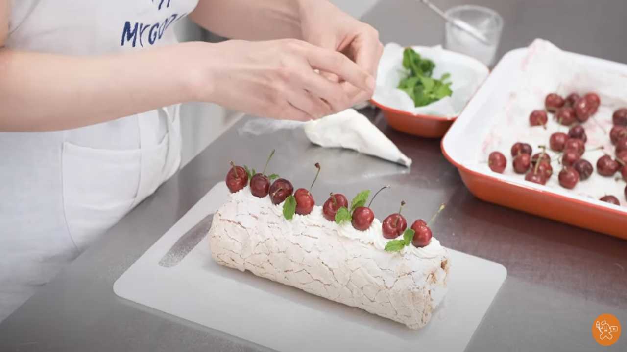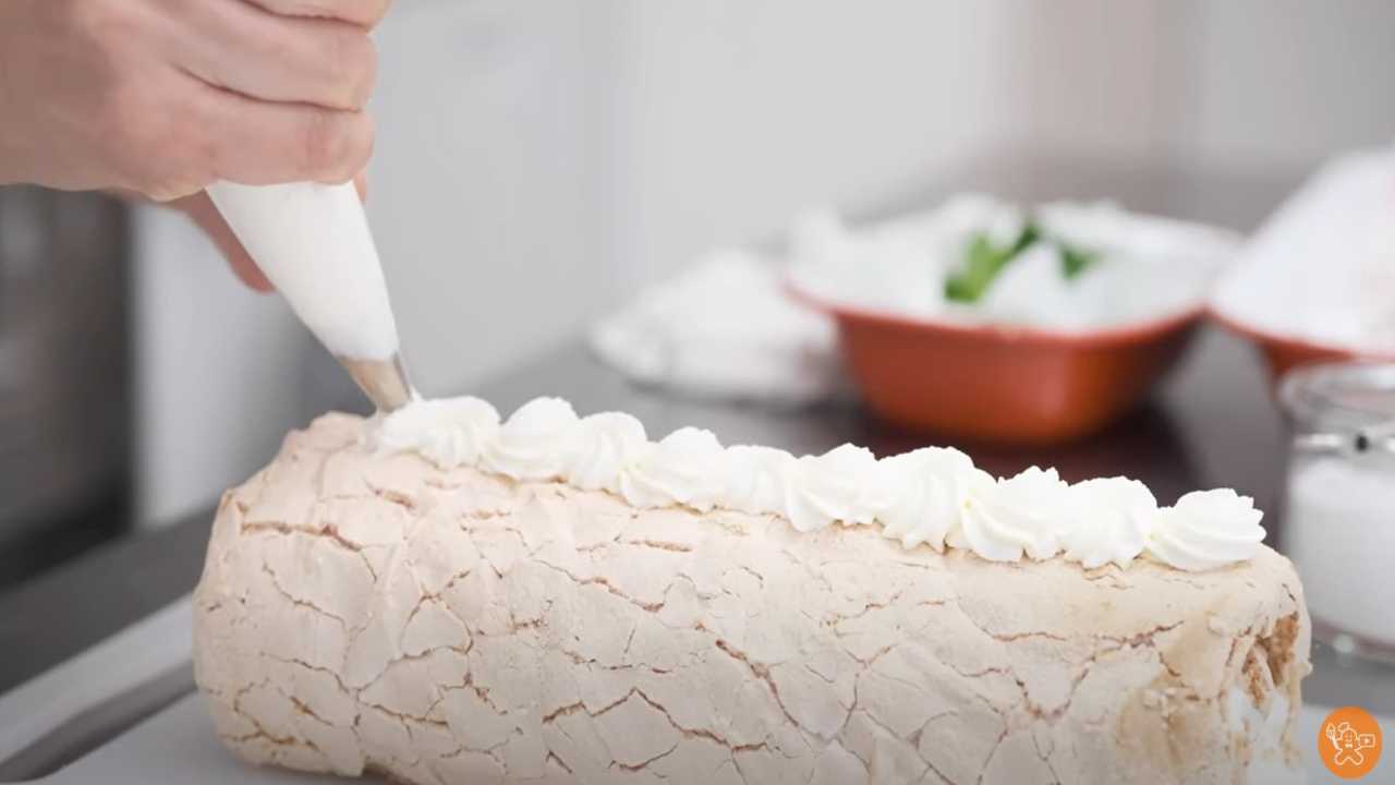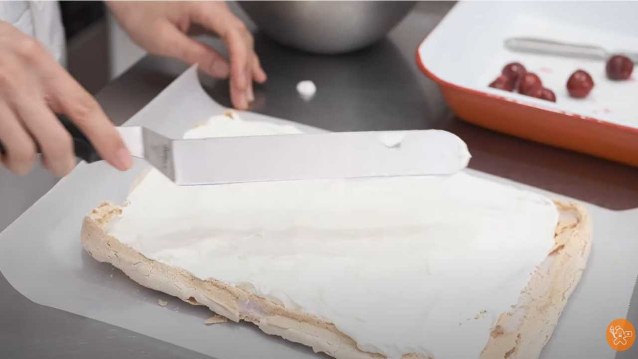 メレンゲ(オーブンシートをはがした面)にクリームを塗る。クリームは左右5mm、巻き終わり部分2~3cmは塗らないようにする。クリームはデコレーション用に少し取っておく。