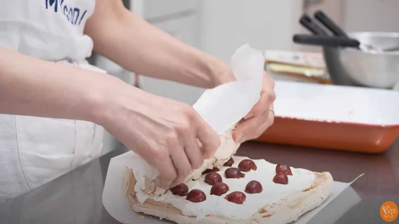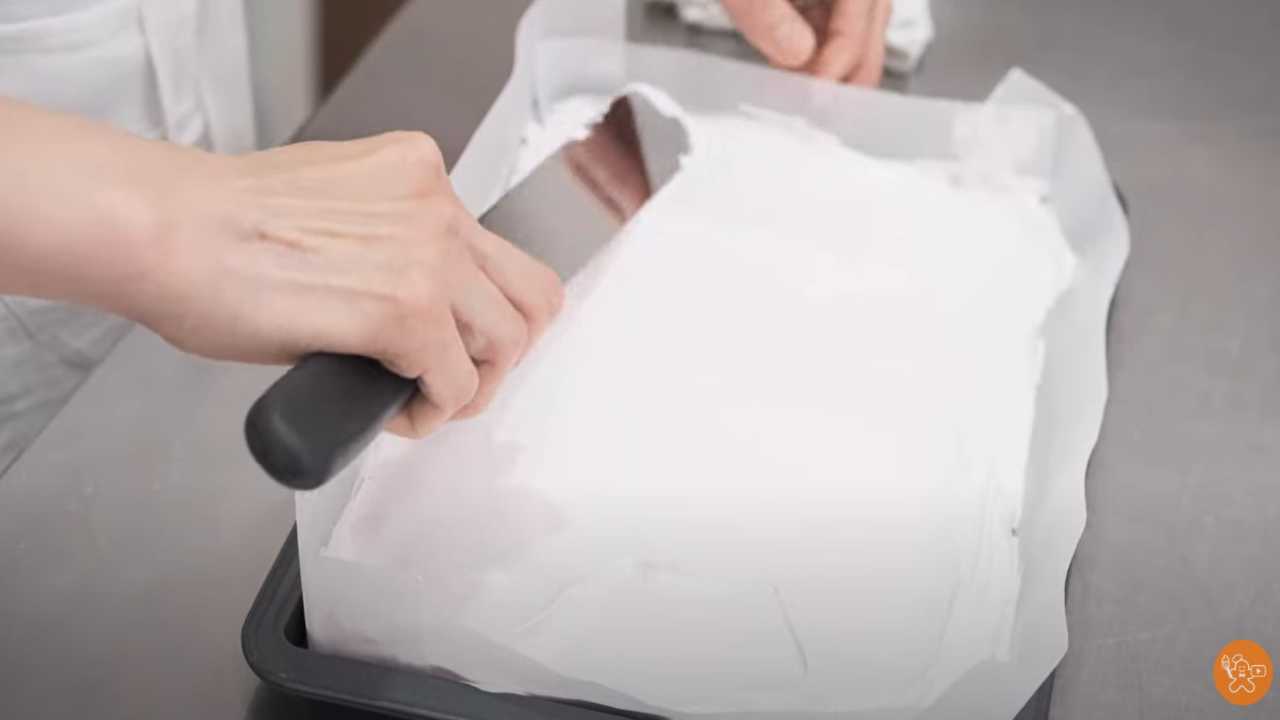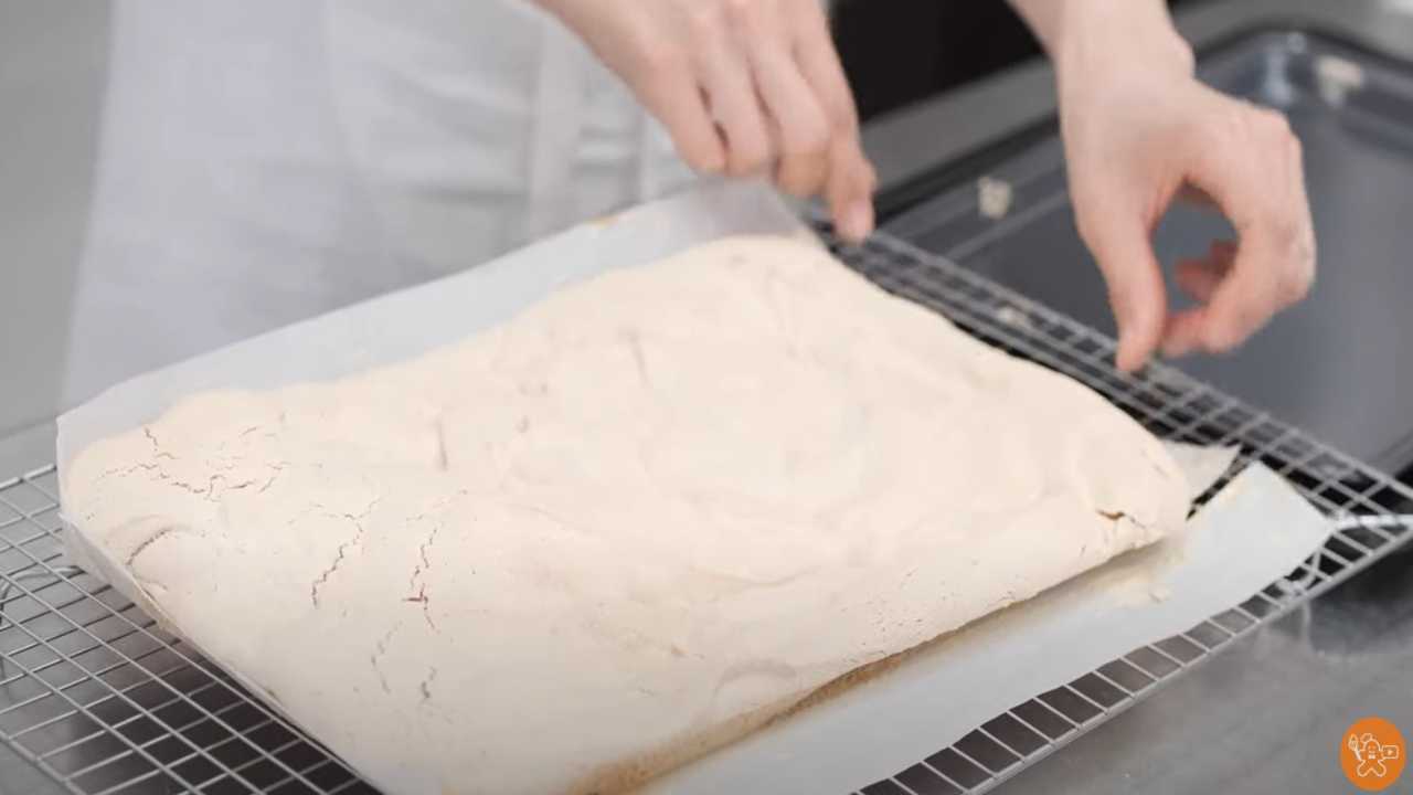 メレンゲよりひと回り大きいオーブンシートを用意し、その上に割れないように慎重に裏返して置く。底面のオーブンシートをはがす。