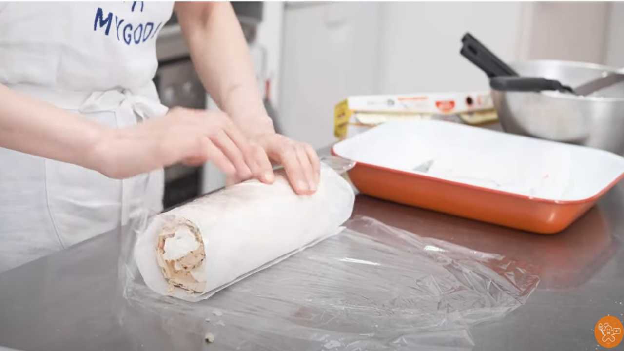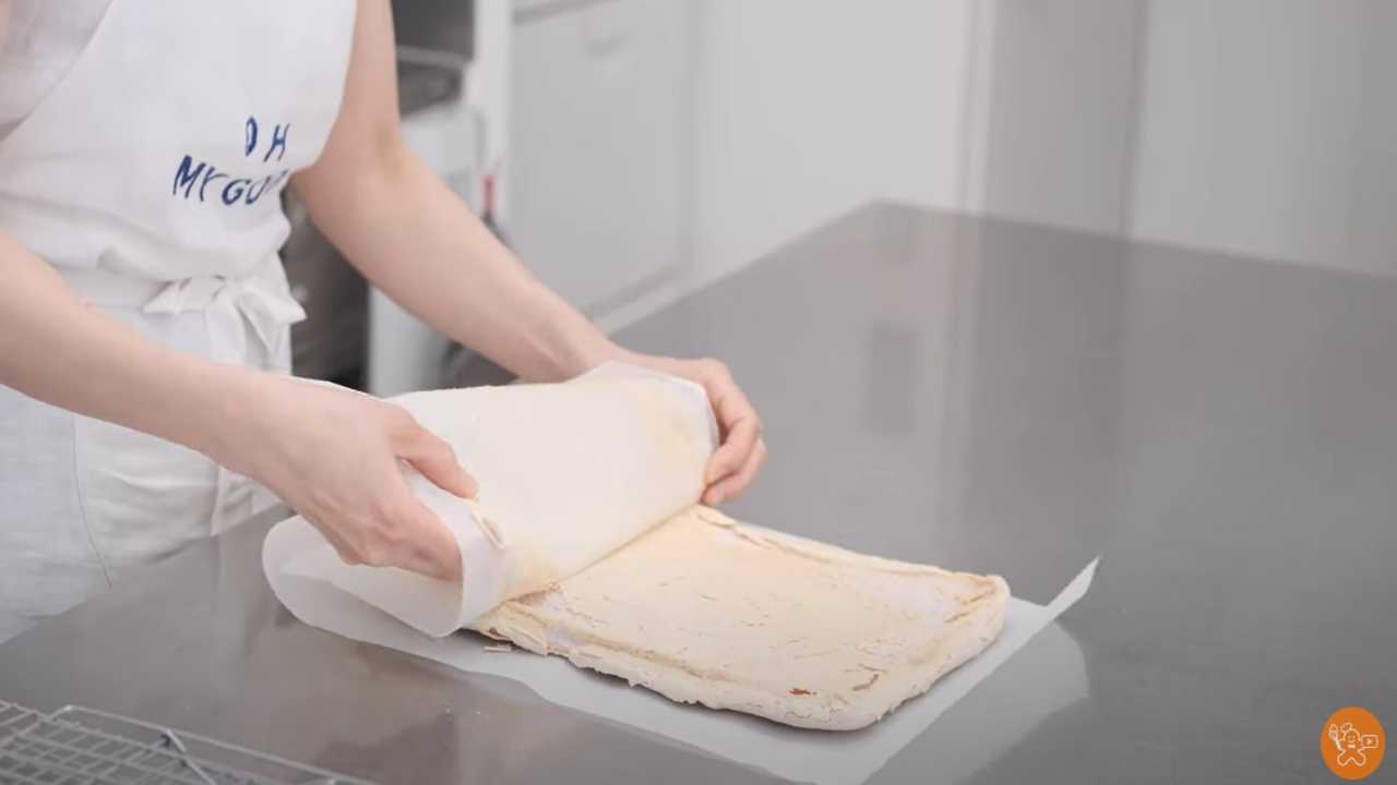 オーブンシートを使いながら、ロールケーキの要領で巻く。メレンゲがミシミシいっても気にしない。