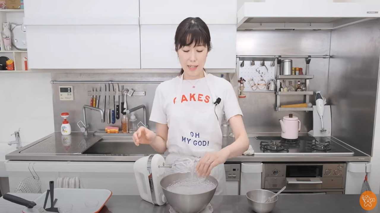 卵白をハンドミキサー(低速)で細かな泡が立つまで泡立てる。細かな泡が立ったら最初は大さじ1程度の少なめのグラニュー糖を加えてハンドミキサーで混ぜる。泡が大きくなってきたら残りのグラニュー糖を3~4回に分けて入れ、ハンドミキサーで混ぜる。ある程度混ざってきたらハンドミキサーを高速に切り替えて混ぜる。