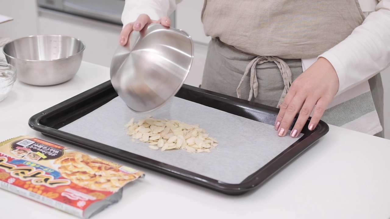 アーモンドスライスを天板に広げて、150℃に下げたオーブンで約10分間焼く。さましておく。