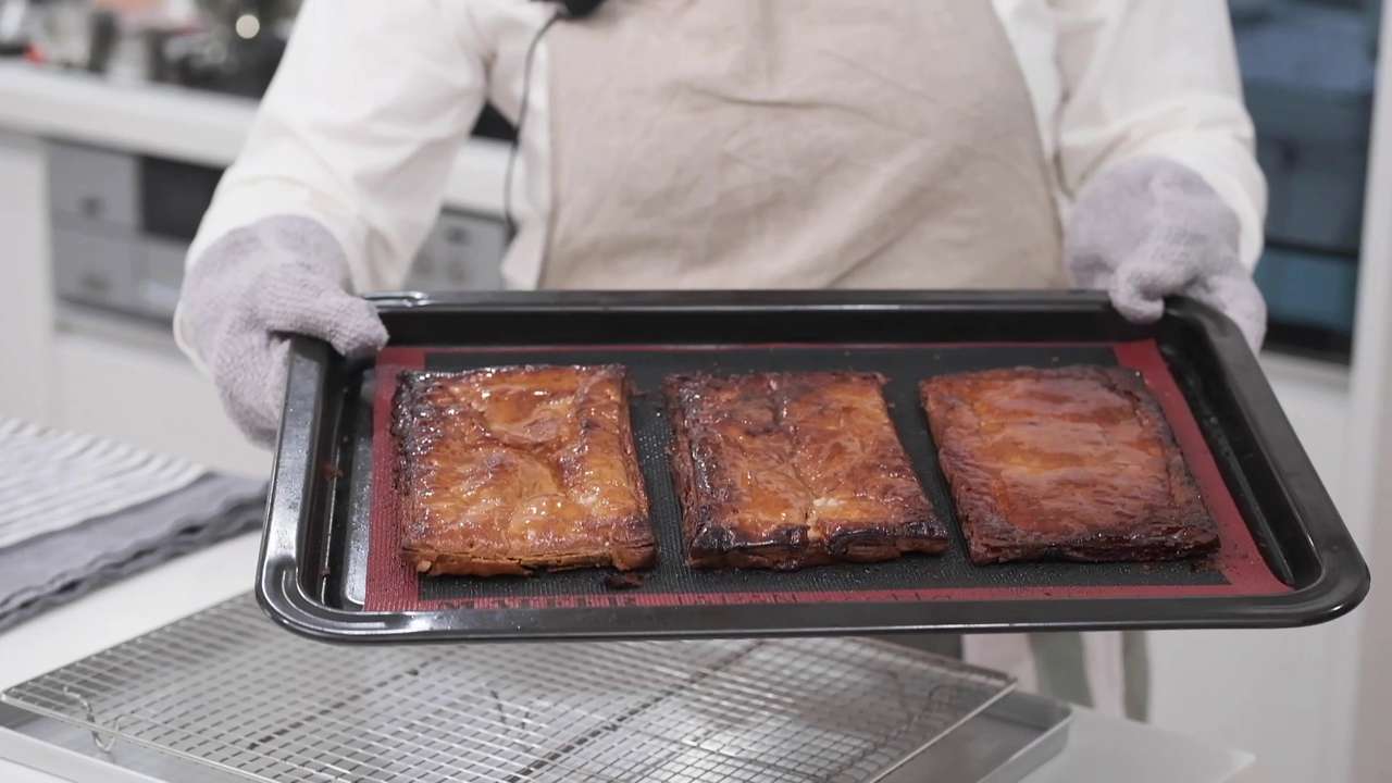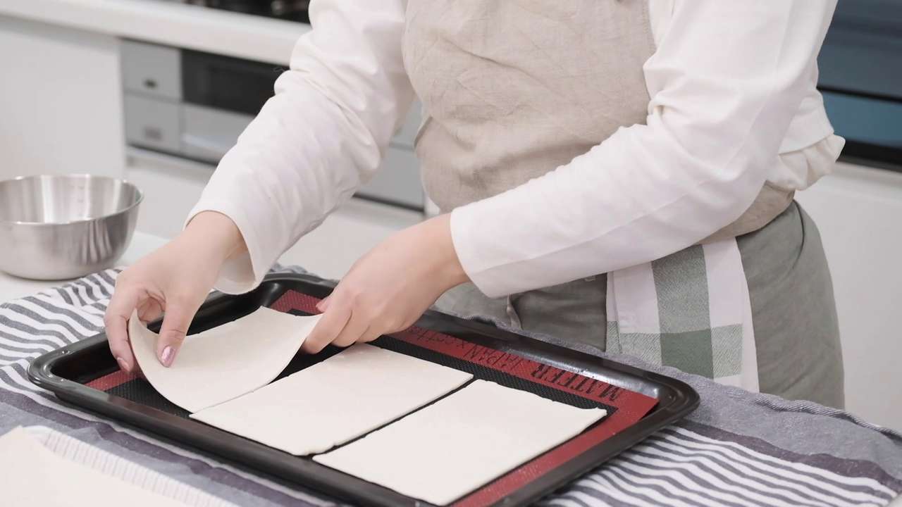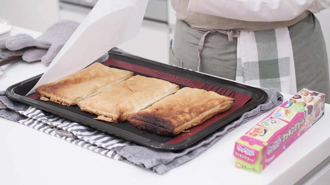 パイ生地を天板に並べて、220℃に下げて10分間焼く。