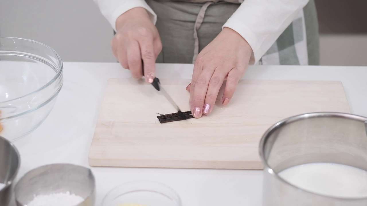 バニラビーンズのさやを包丁で割いて、ビーンズをこそげ取る- 2