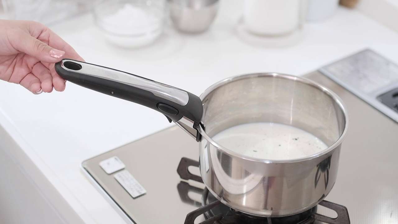 牛乳が入った鍋を再び沸騰させ、卵黄に半分程度加えて混ぜる。- 2