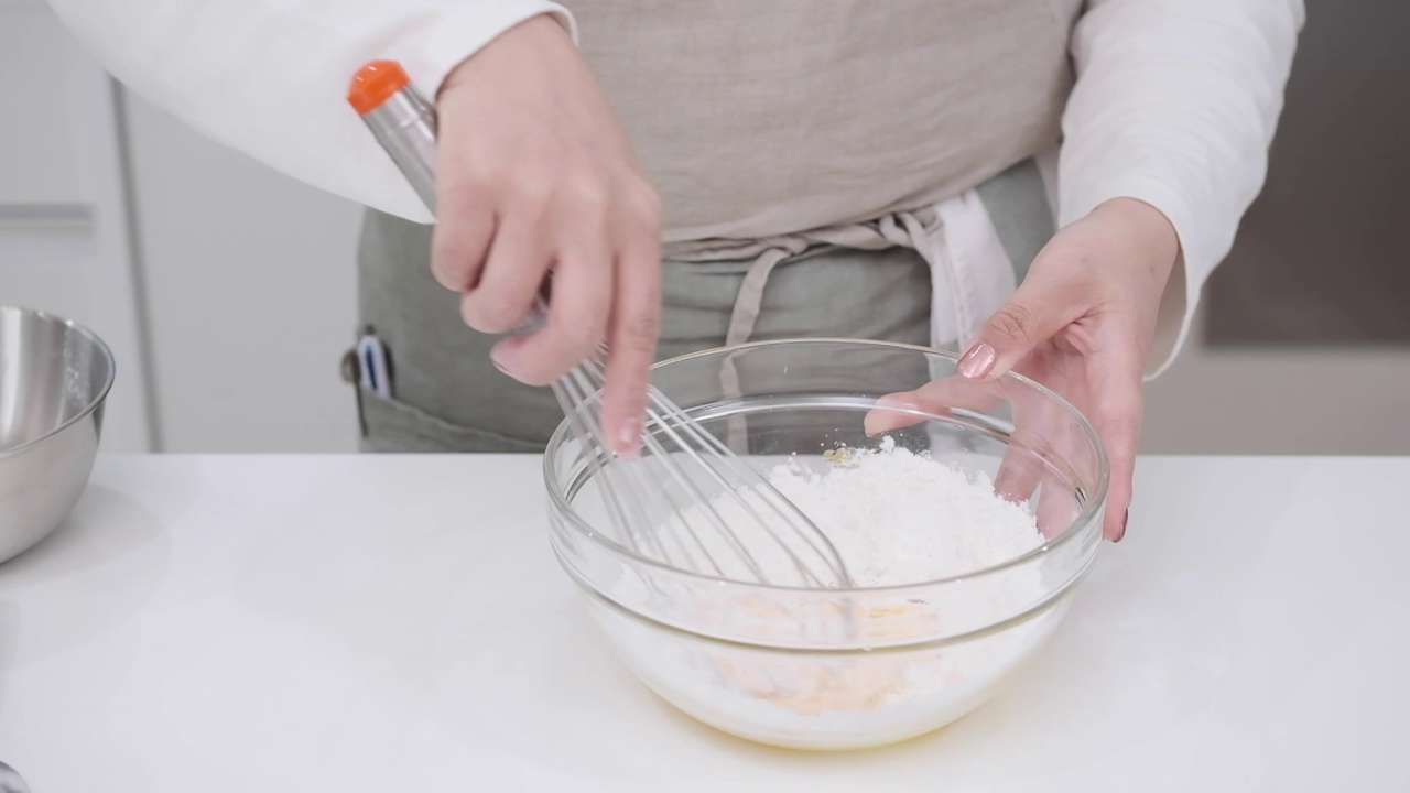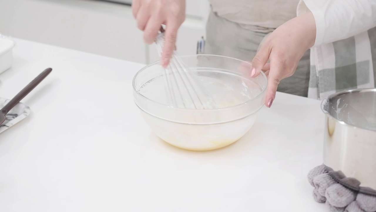 別のボウルに卵黄と残りのグラニュー糖を入れて混ぜ、ふるったコーンスターチと薄力粉を合わせる。