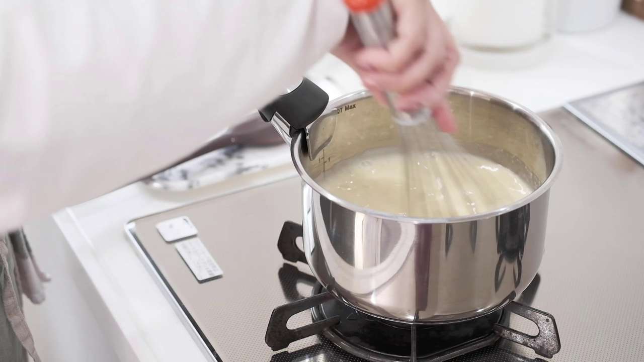 中火にかけて、焦げないように気を付けながらホイッパーで混ぜ続ける。