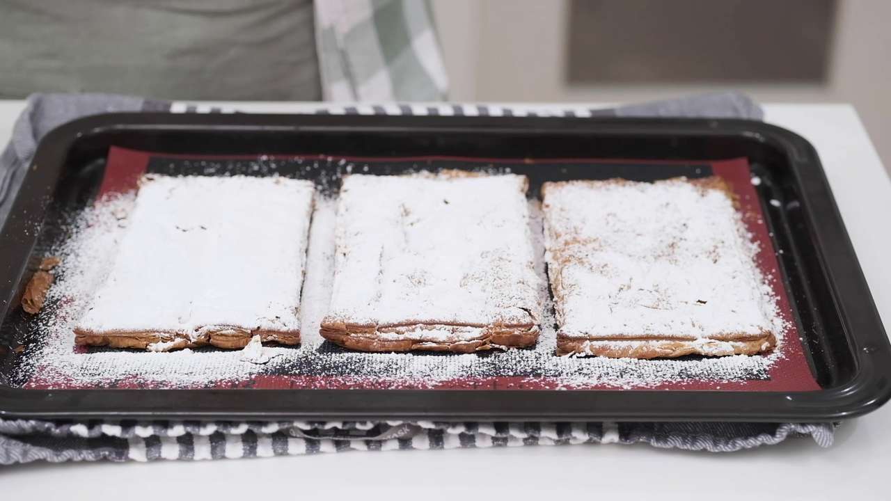オーブンを220℃に上げて、重しの天板をはずす。粉糖をたっぷりと2回振って、さらに10分間焼く。- 2