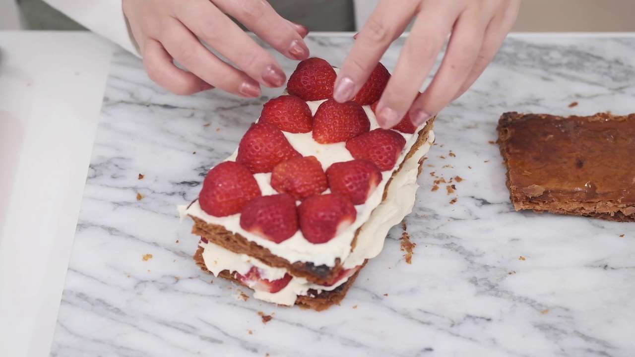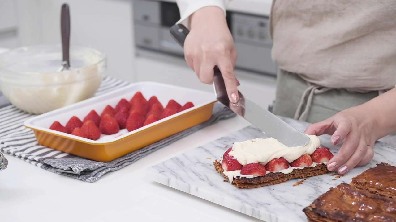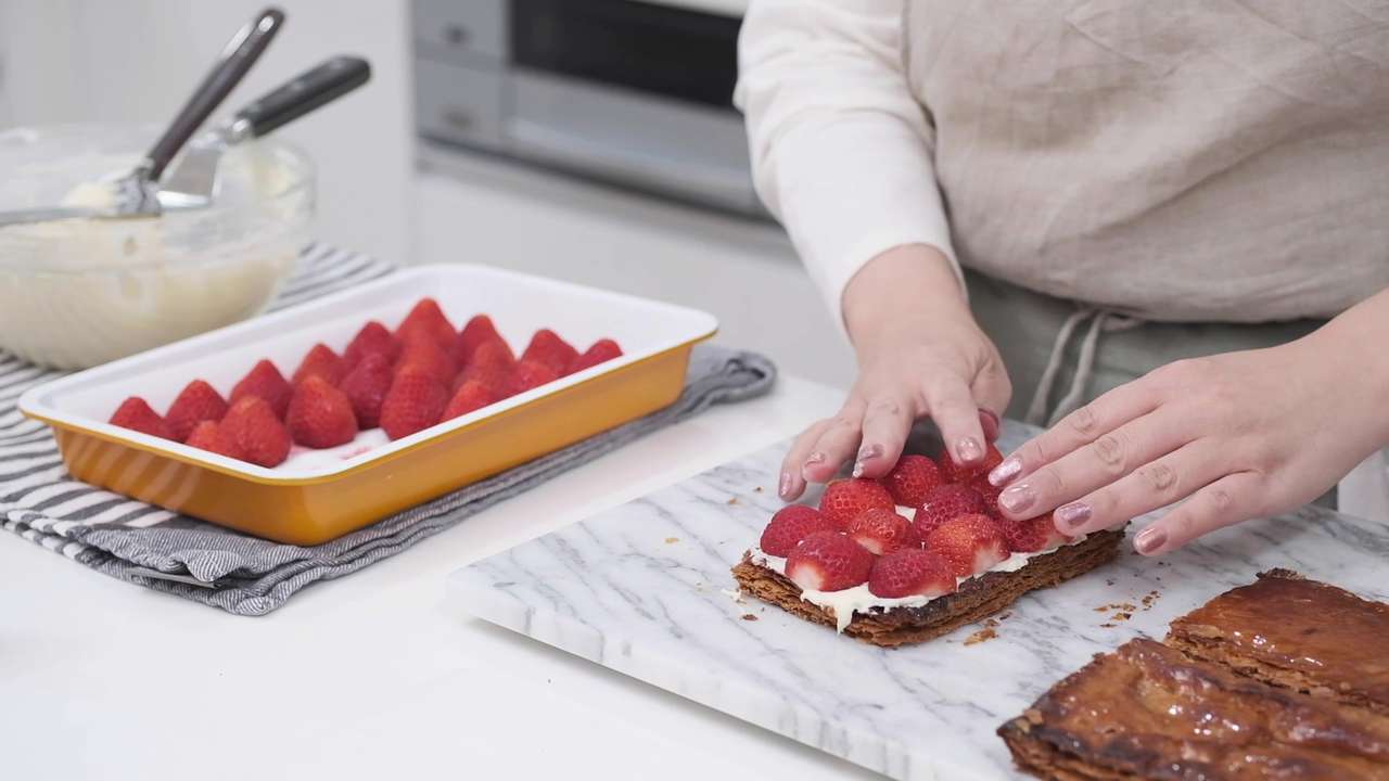 パイを1枚重ね、再度クリームを塗ってイチゴをのせる。- 4