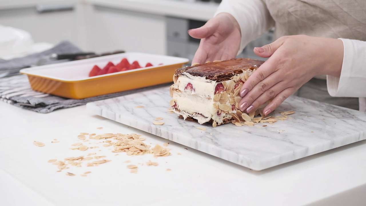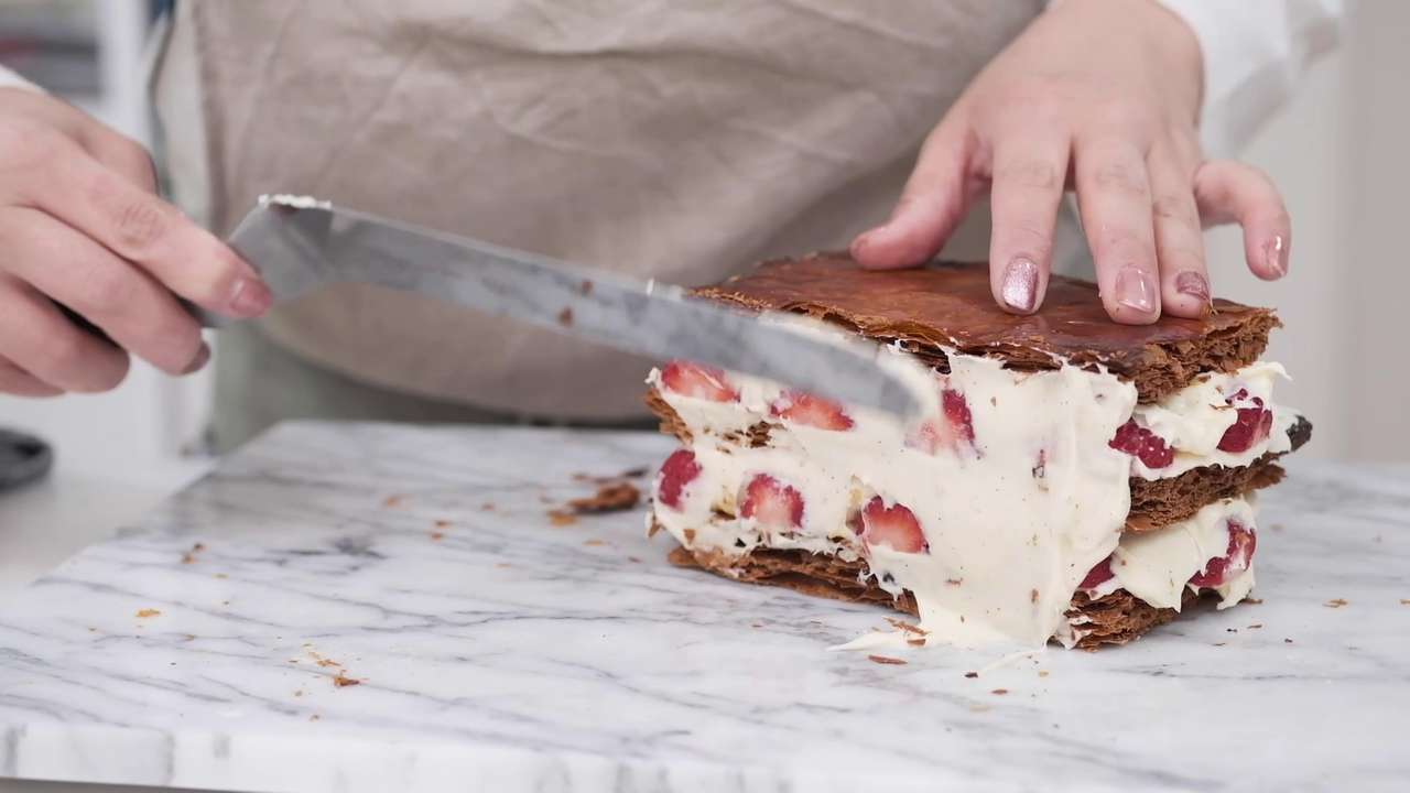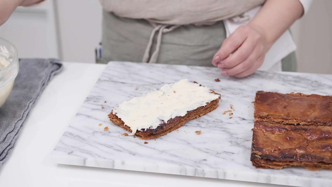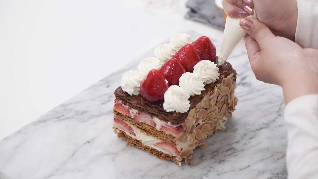 パイを1枚重ね、再度クリームを塗ってイチゴをのせる。- 4