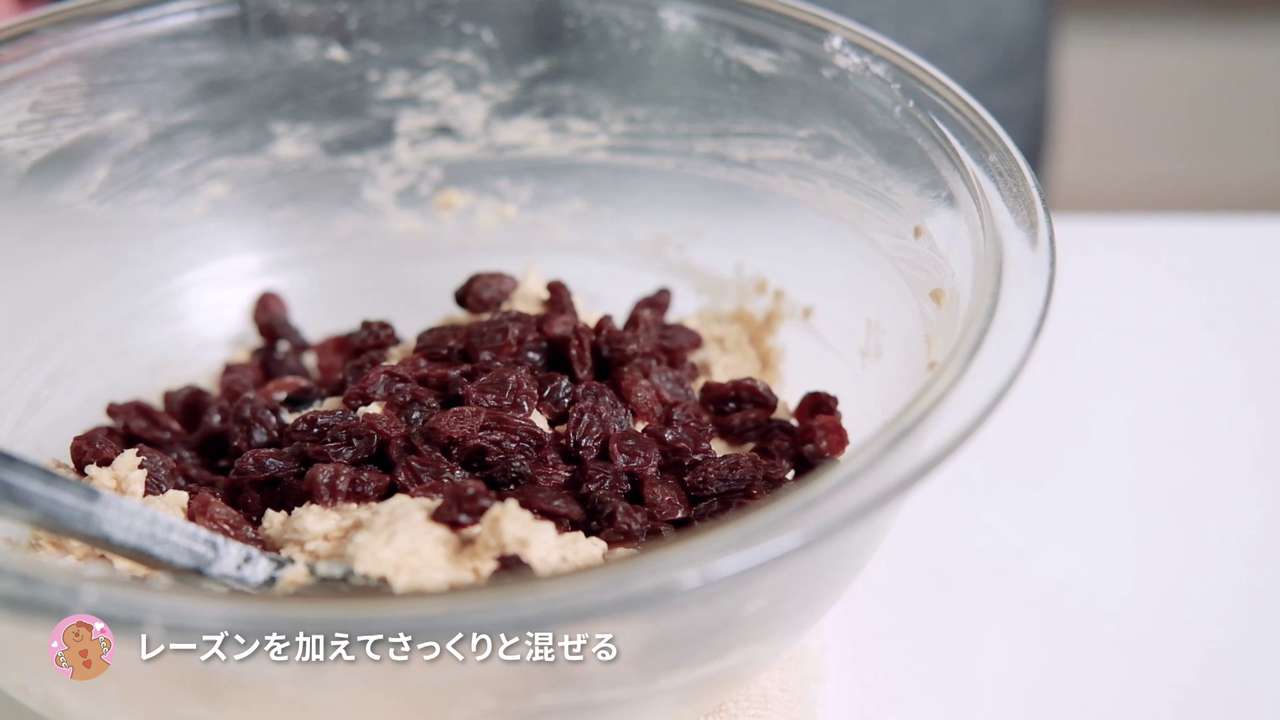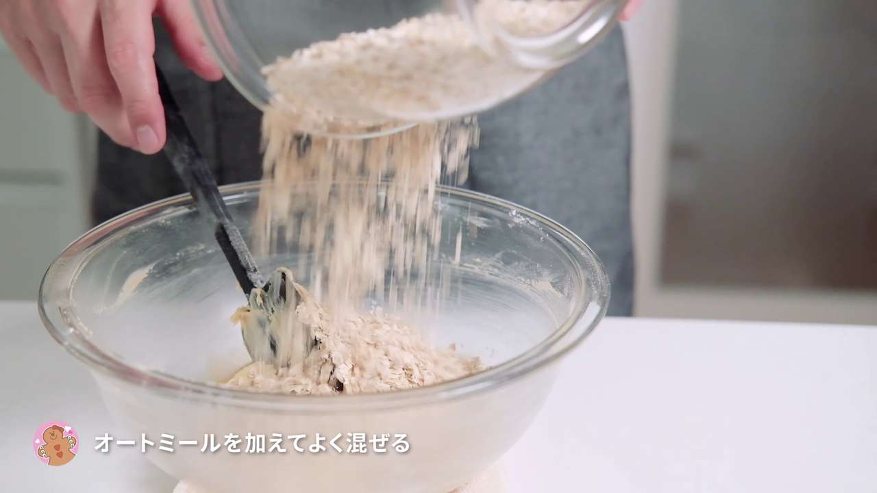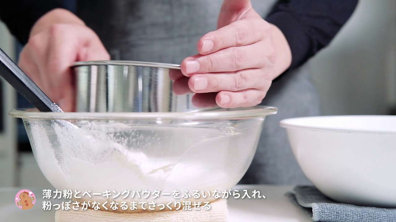 薄力粉とベーキングパウダーをふるいながら入れ、粉っぽさがなくなるまでさっくり混ぜる- 5