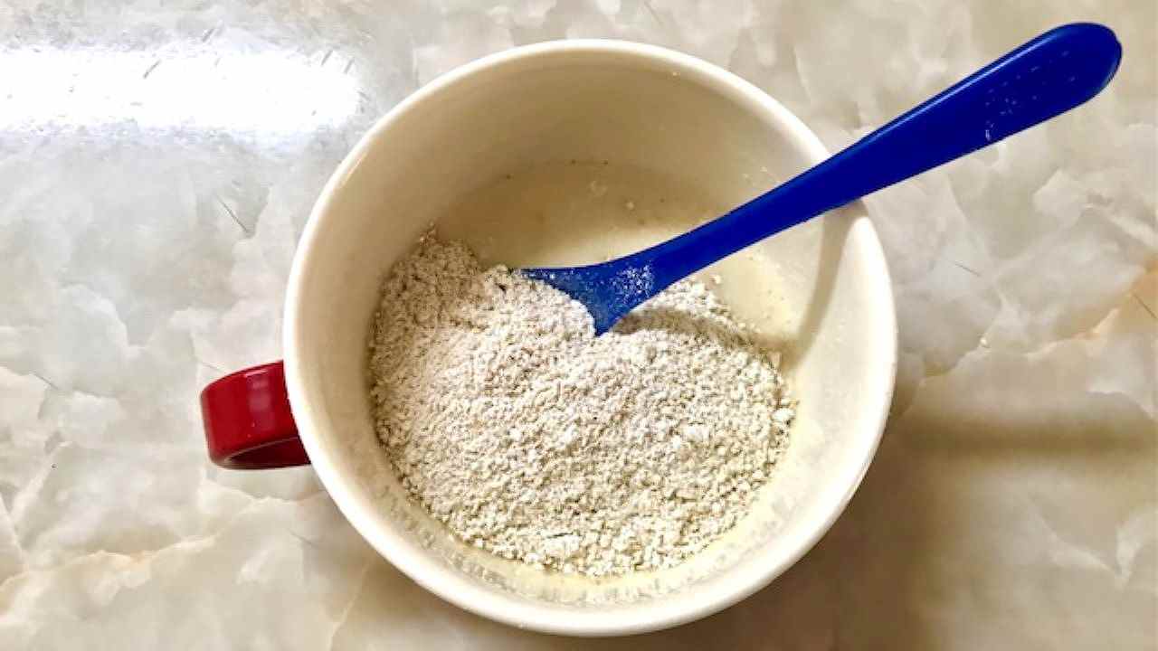 オートミール、ベーキングパウダーを加えたら再び混ぜます。