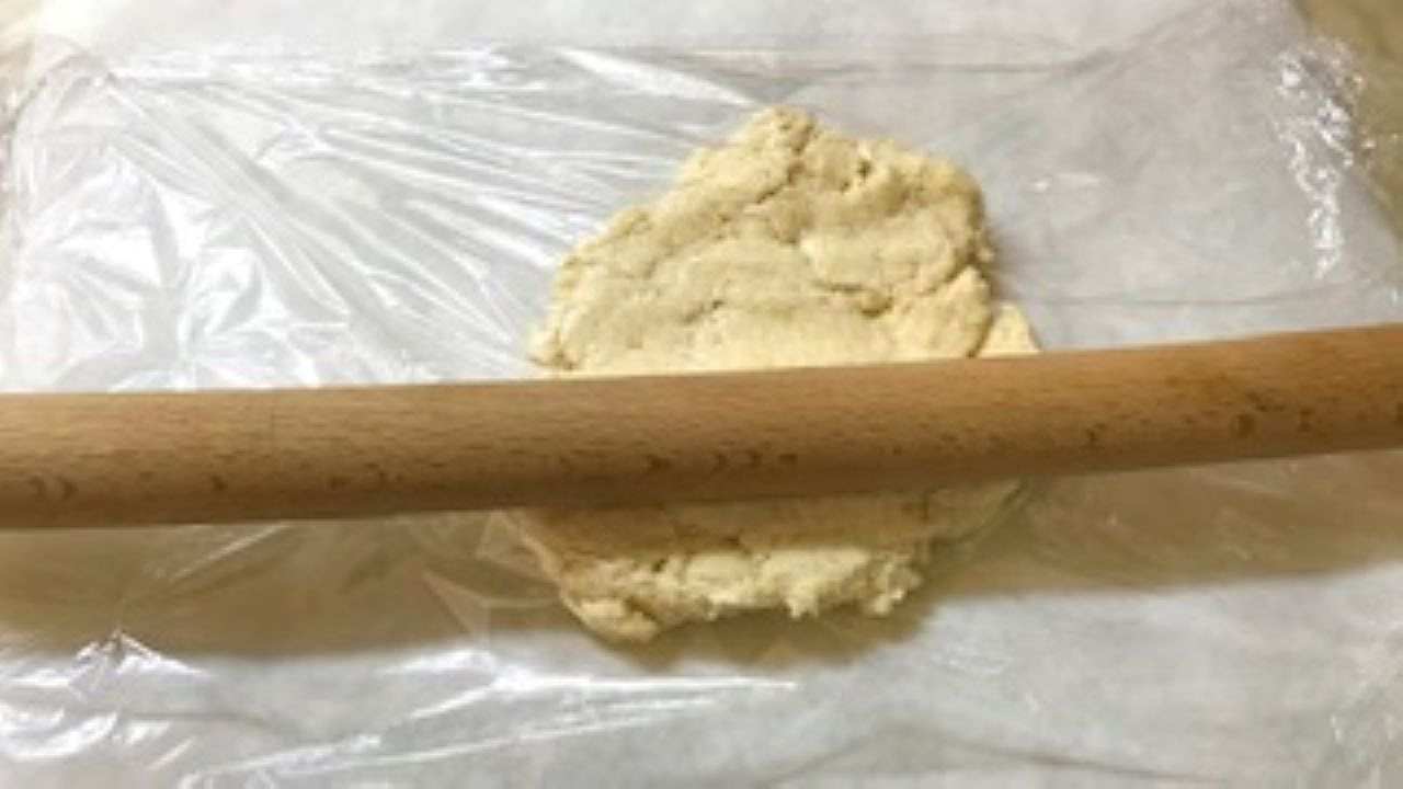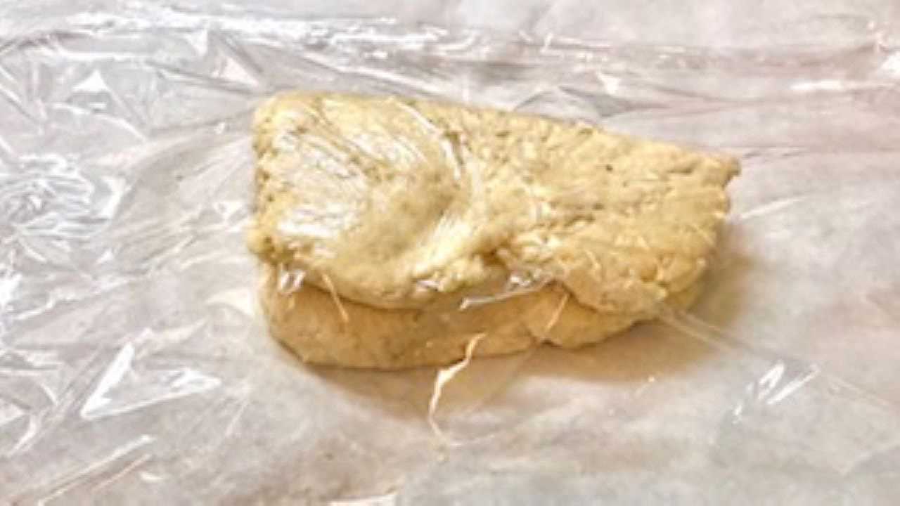 台の上にクッキングシートを敷いて生地を置く。その上にラップをのせて麺棒でやさしく2cmの厚さに伸ばす。