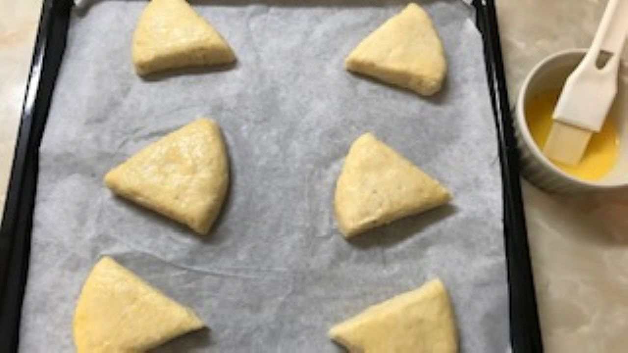 クッキングシートを敷いた天板にカットした生地を並べ、表面に溶き卵を塗る。