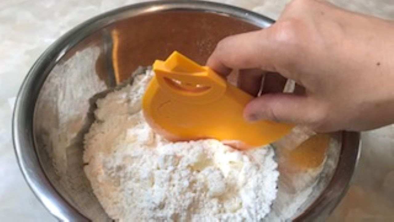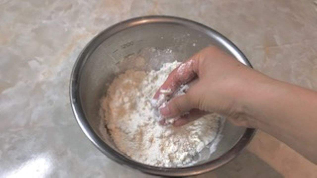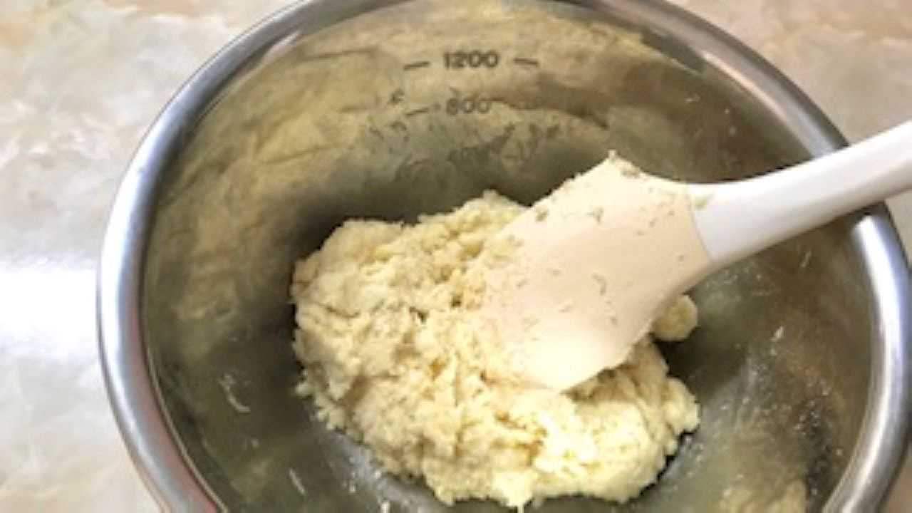 ある程度混ざったら、指先を使ってバターをつぶすように粉と混ぜ合わせ、粉チーズのようなそぼろ状にする。