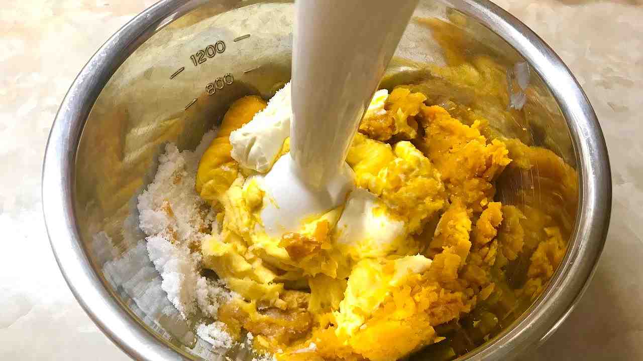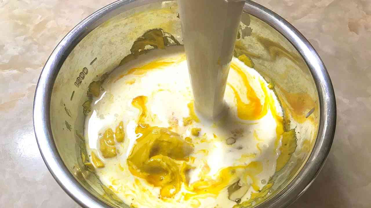卵、生クリーム、レモン果汁を加えたらブレンダーにかけ、全体が均一に混ざり合うまで撹拌します。