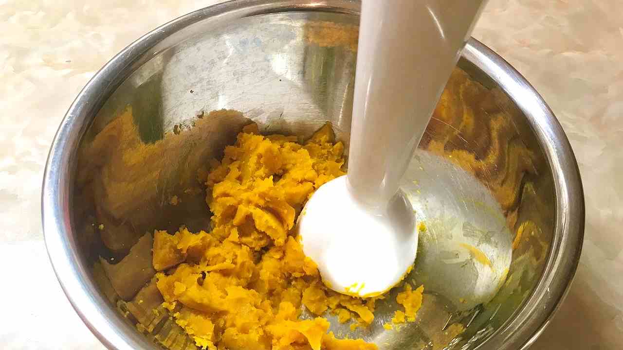 種とワタを取って蒸したかぼちゃ(レンジ加熱の場合は、500Wで目安として3分半~4分半)は皮をむき、 ペースト状になるまでブレンダーにかけます。