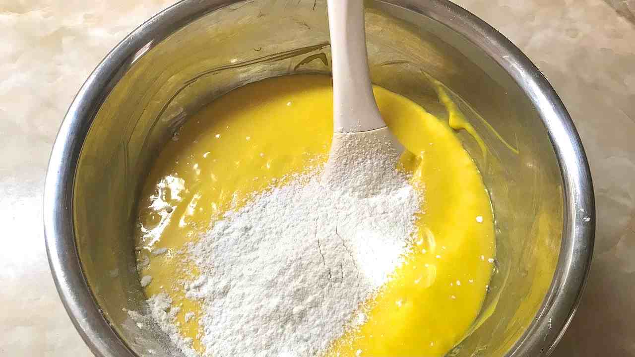 3に薄力粉を加え、粉っぽさがなくなるまで切るように混ぜ合わせます。