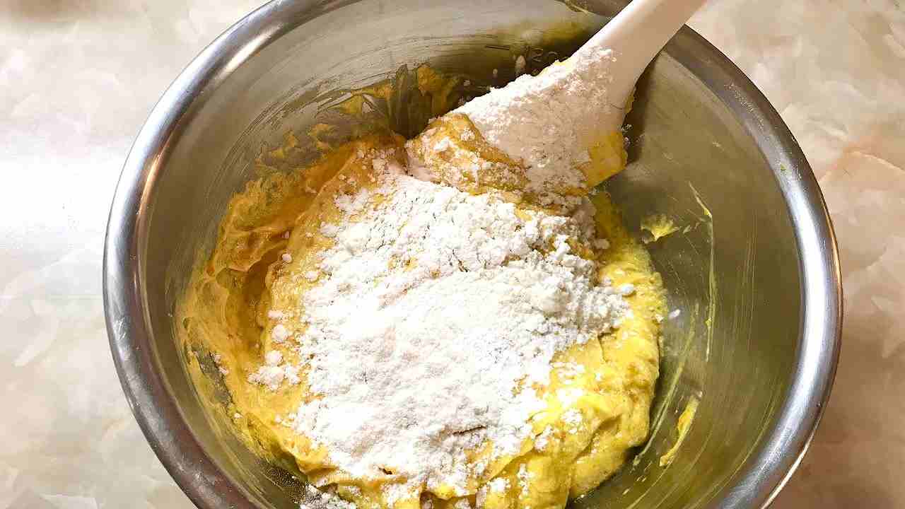ふるった粉類を数回に分けて入れ、ゴムべらで生地を底からすくって返すように混ぜ合わせます。切るようにさっくりと混ぜ合わせることが大切。生地に少しツヤが出てきたら混ぜは完了です。