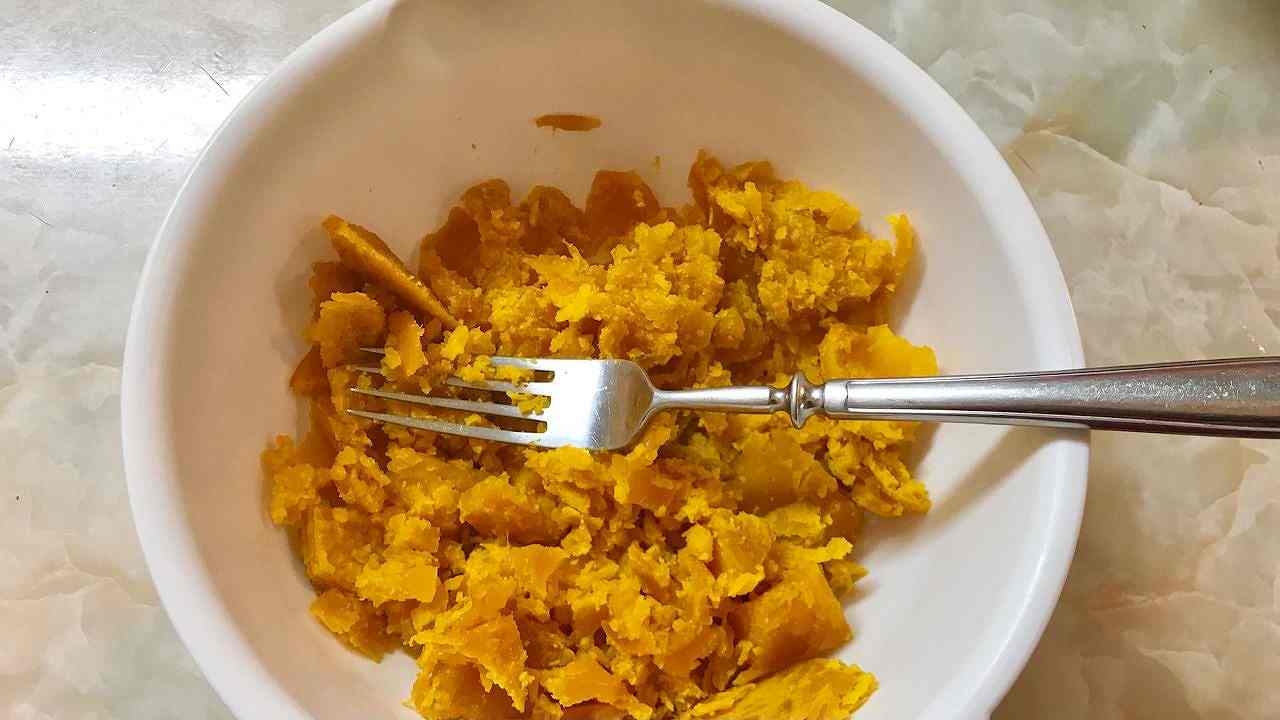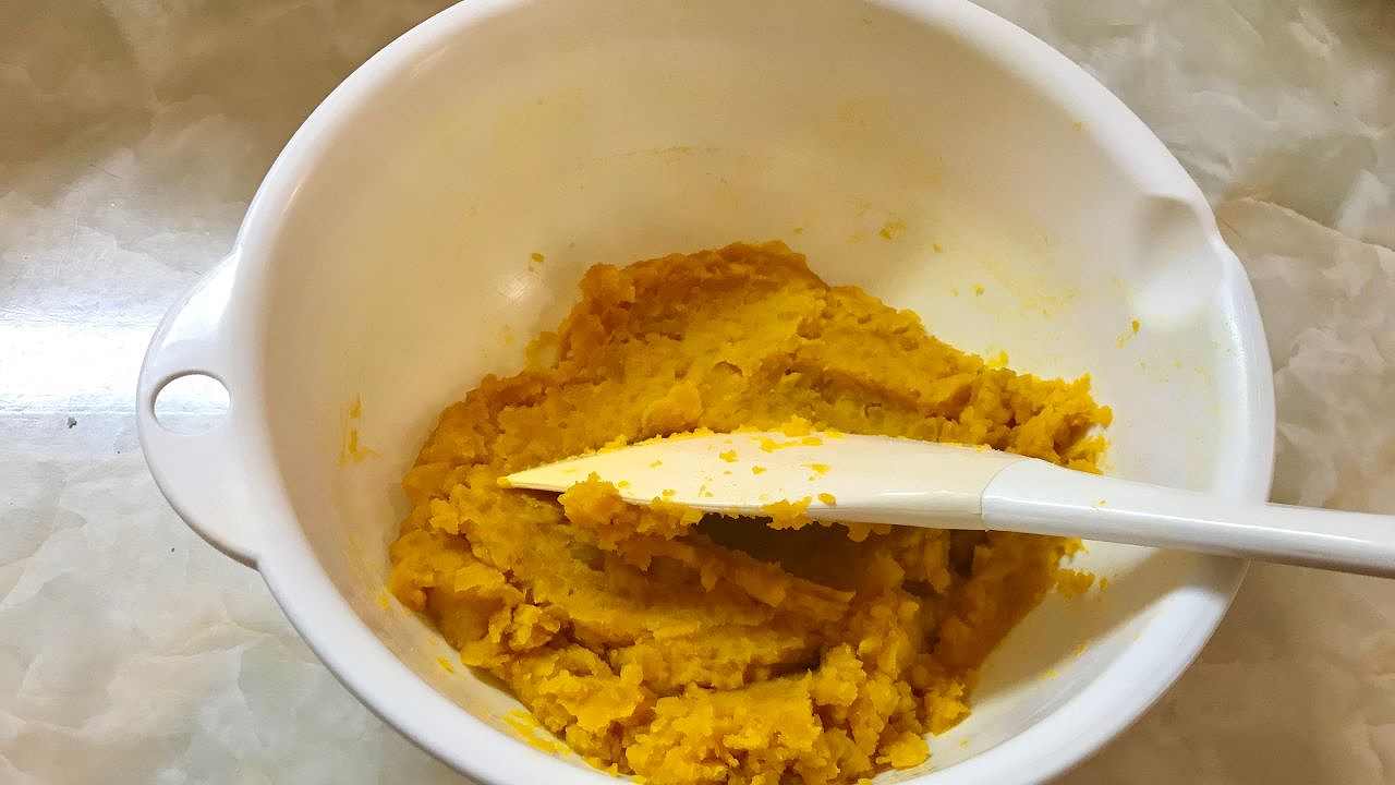種を取って蒸したかぼちゃ(レンジ加熱の場合は、500Wで目安として3分半~4分半)は皮をむき、フォークやマッシャーなどでつぶします。