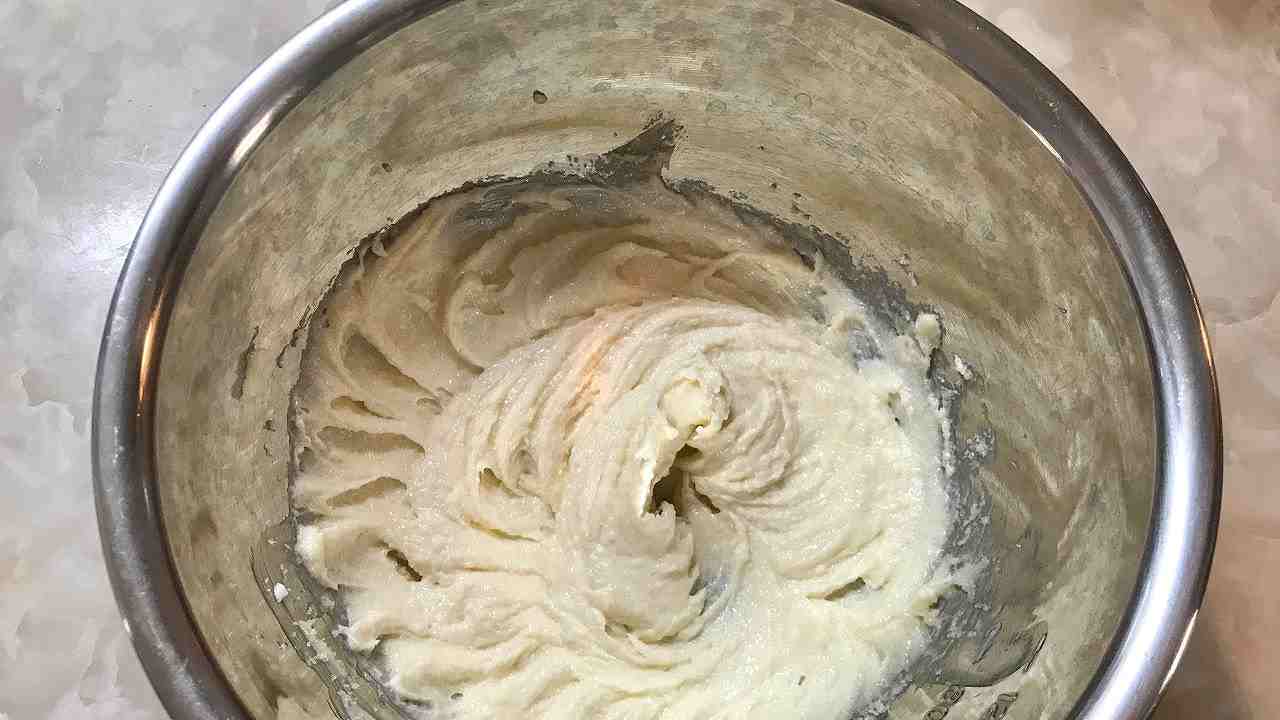 ボウルにバターを入れ、ハンドミキサーまたは泡立て器でなめらかなクリーム状になるまで練り混ぜます。