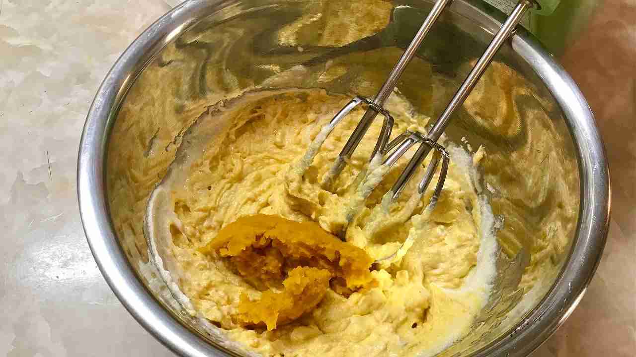 4へかぼちゃのペーストを数回に分けて加え、混ぜ合わせます。