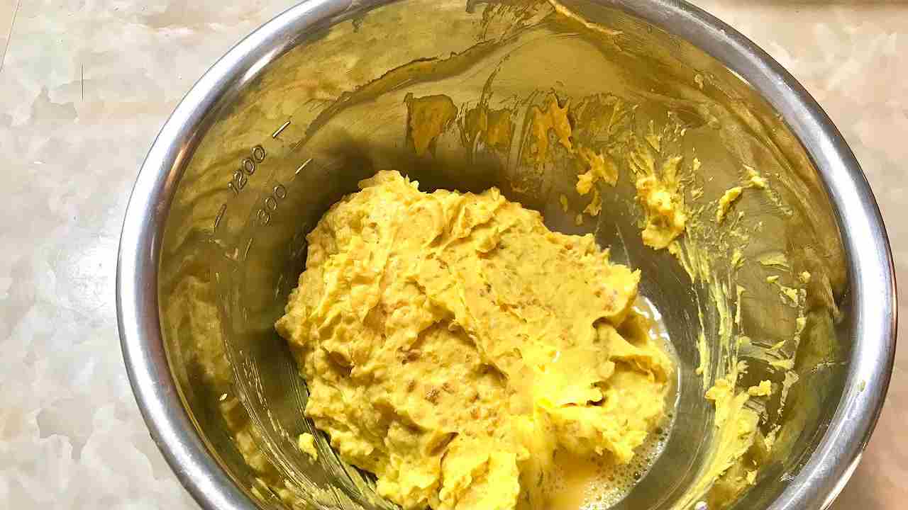 溶き卵を4~5回に分けて入れ、混ぜ合わせます。一度に入れると分離しやすいので少しずつ加えることがポイントです。分離するとボソボソした仕上がりになるので注意してください。