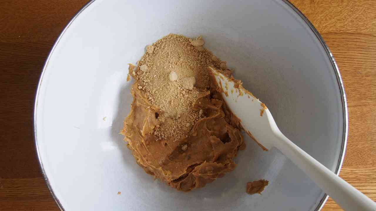 ピーナッツバターとメープルシュガーを混ぜ合わせる。