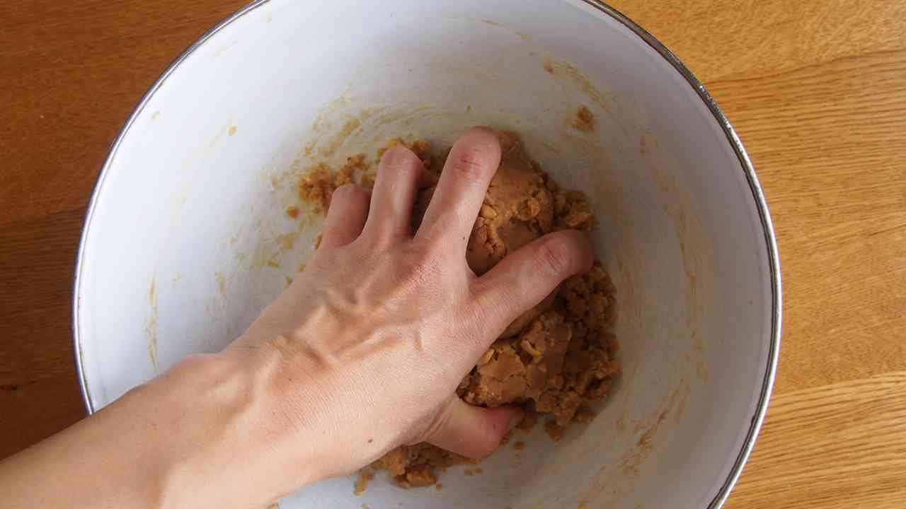この時になかなかまとまらないようであれば少量の豆乳か水を加え、まとめる。