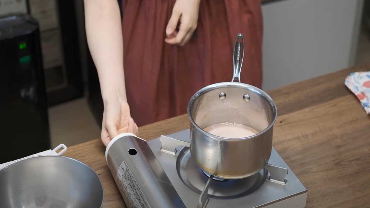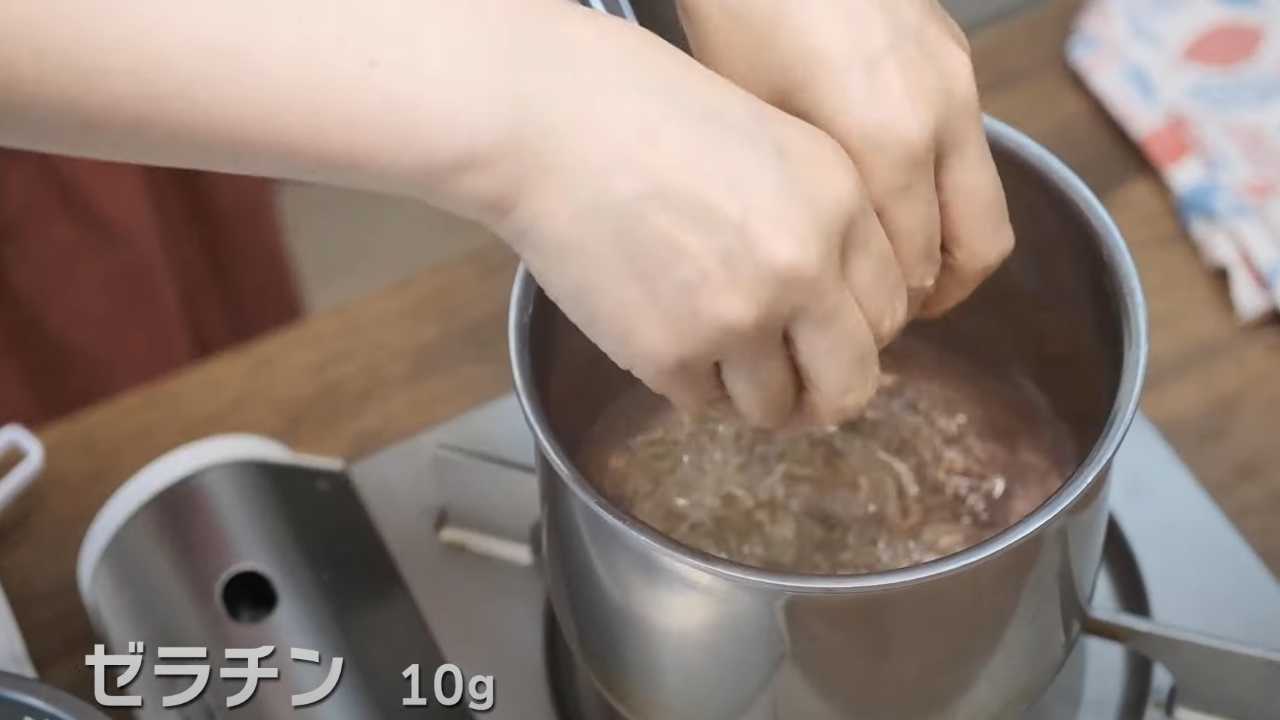火を止めて、ふやかしたゼラチンの水気をよく切って加え、余熱で溶かす。- 3