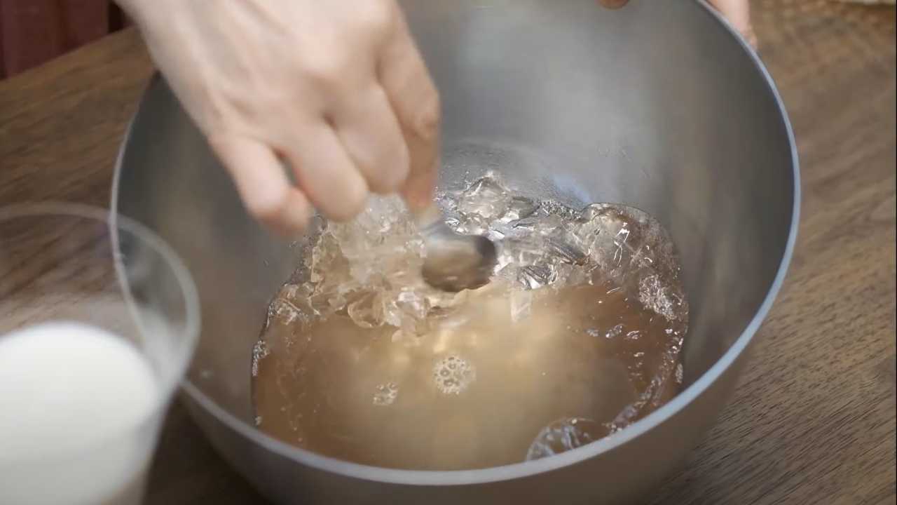 ゼラチンが溶けたらボウルに移して氷水に当てる。ボウルの底を触ったときに温かくないくらいまで冷やす。- 4
