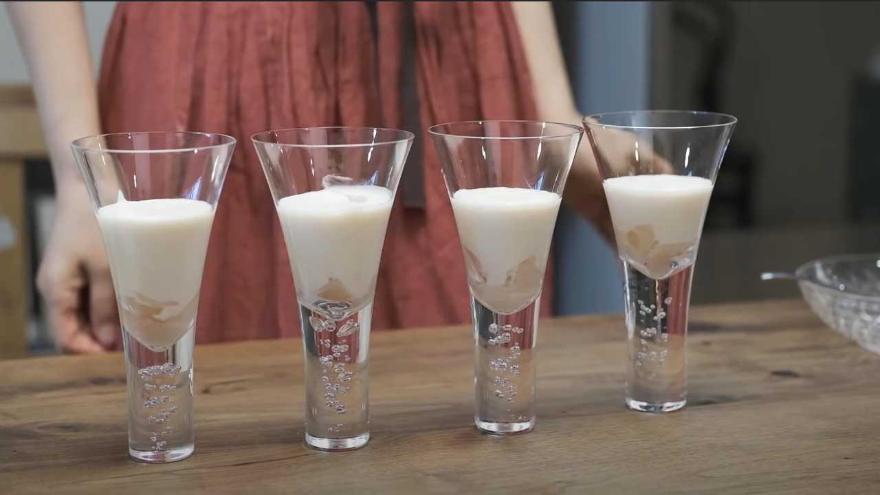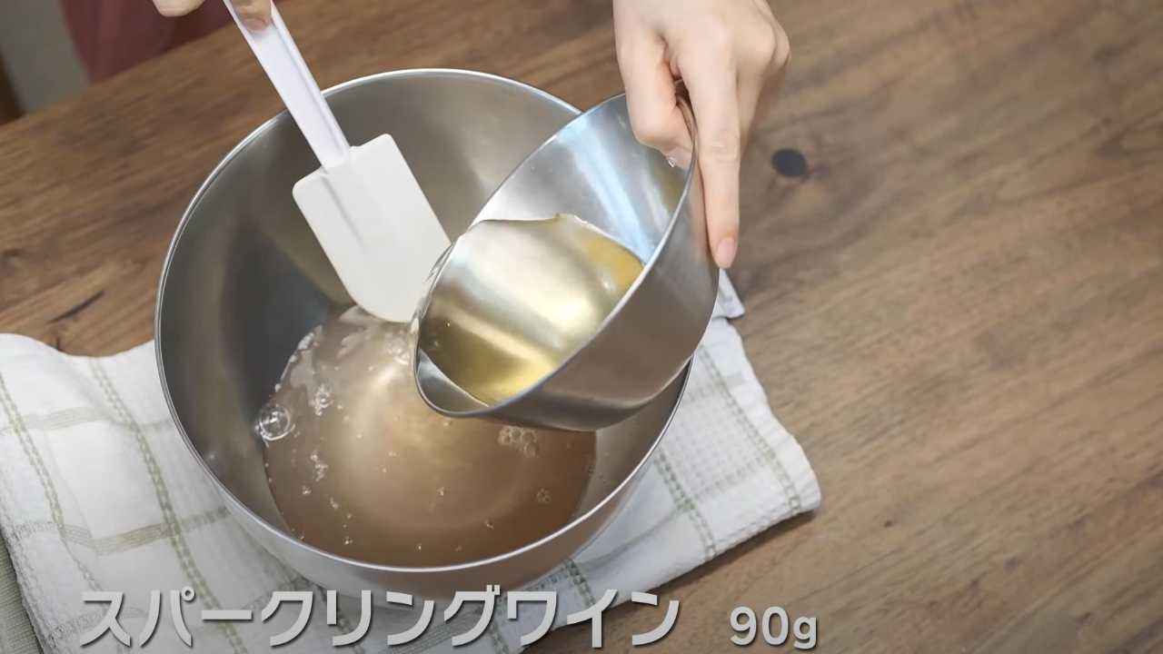 粗熱が取れたら、スパークリングワインを加えて軽くゴムベラで混ぜる。ボウルごと冷蔵庫に入れて約30分間、冷凍庫なら約15分間冷やし固める。