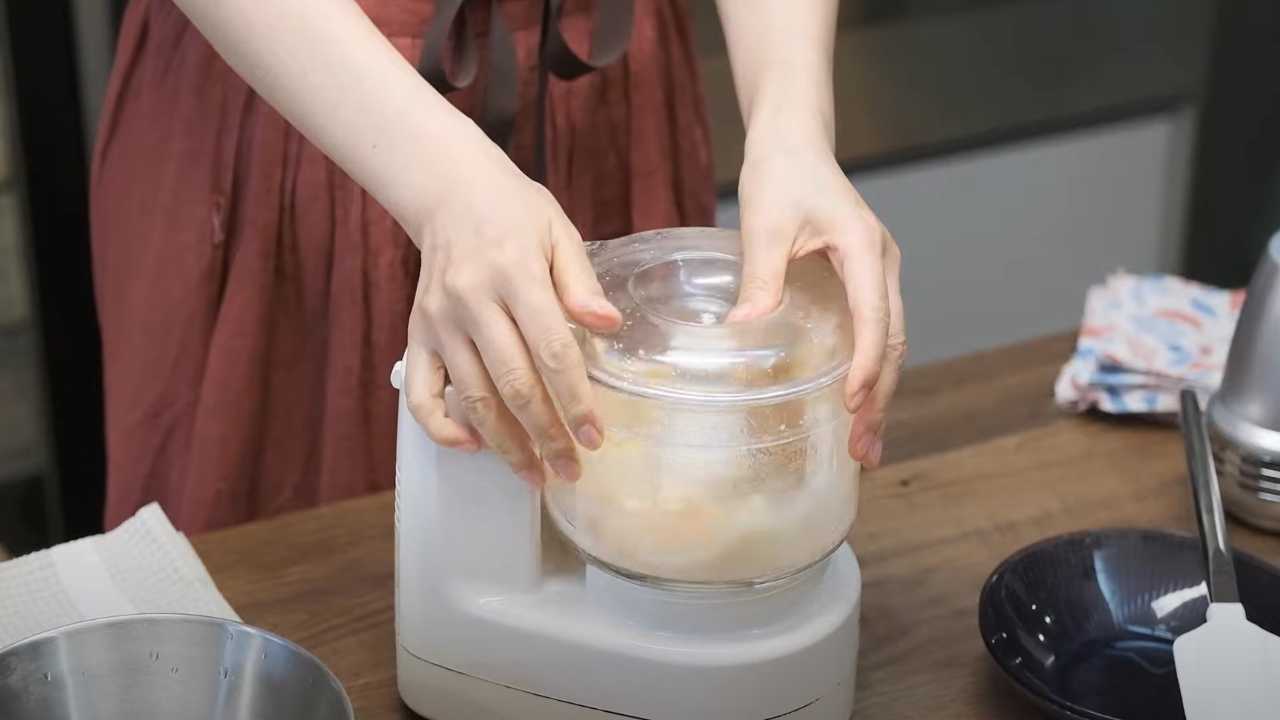 フードプロセッサーに桃、スパークリングワイン、レモン果汁、グラニュー糖を入れて、ピューレ状に撹拌する。- 2