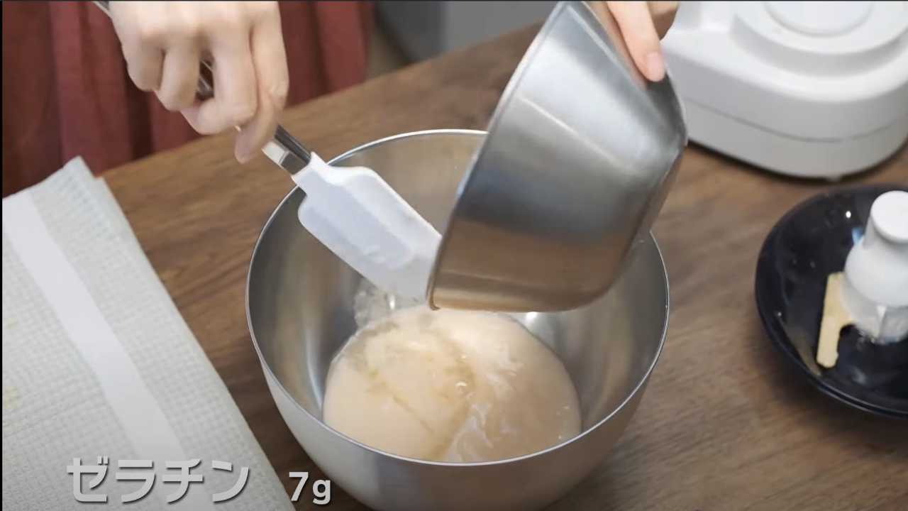 ボウルに移し、水気をよく切って湯煎で溶かしたゼラチンを加えてゴムベラで混ぜる。- 3