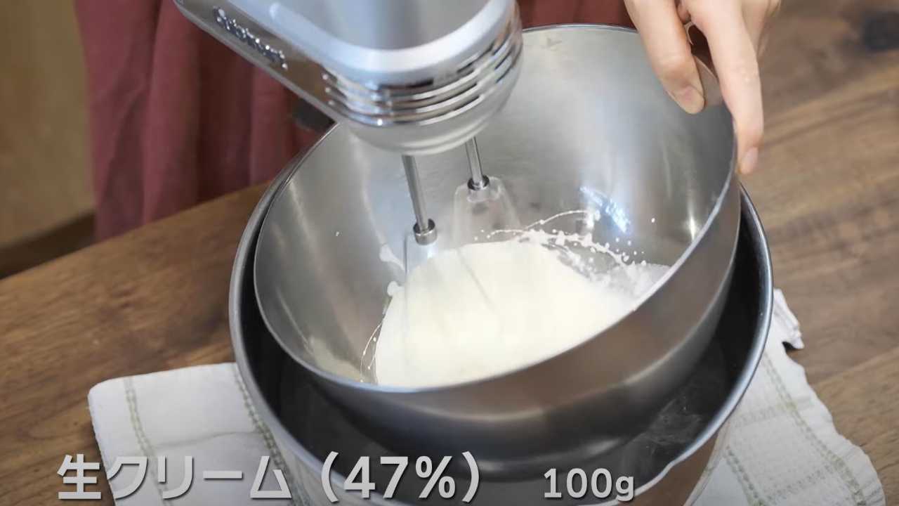 別のボウルに生クリームを入れ、7分立てに泡立てる。- 4